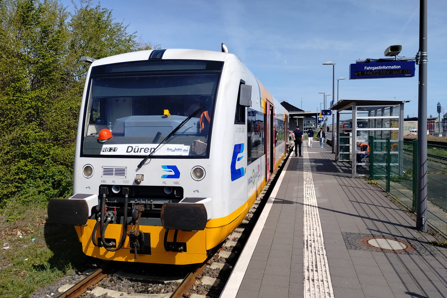 Am 12.03.2026 ist der VT 504 006 der Rurtalbahn im Bahnhof Aachen West abgestellt. Bei ihm handelt es sich die einstöckige Version des von der Deutsche Waggonbau AG entwickelten Doppelstocktriebwagen der DB-Baureihe 670, von ihm wurden einschließlich des Prototyps 26 Exemplare geliefert. Er soll im Rahmen eines Forschungsprojektes als selbstfahrender Zug auf der Bahnstrecke Jülich - Linnich eingesetzt werden.