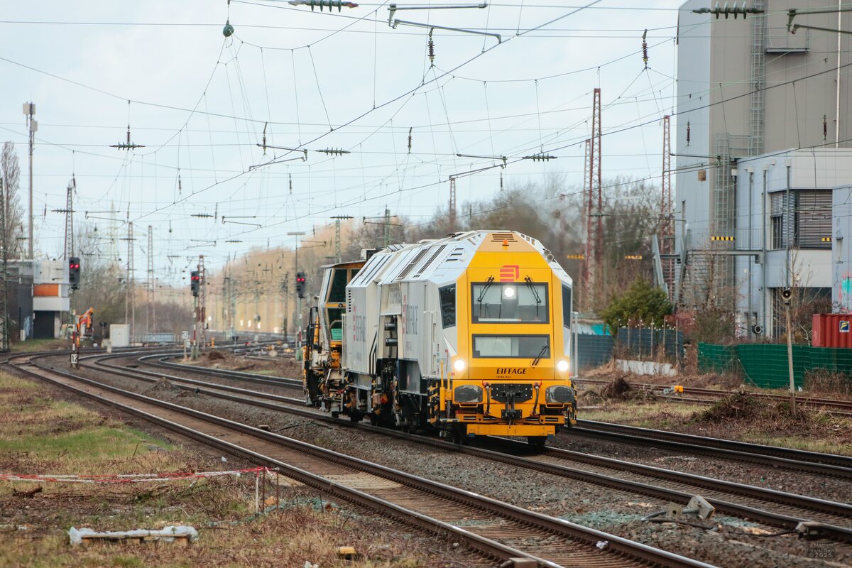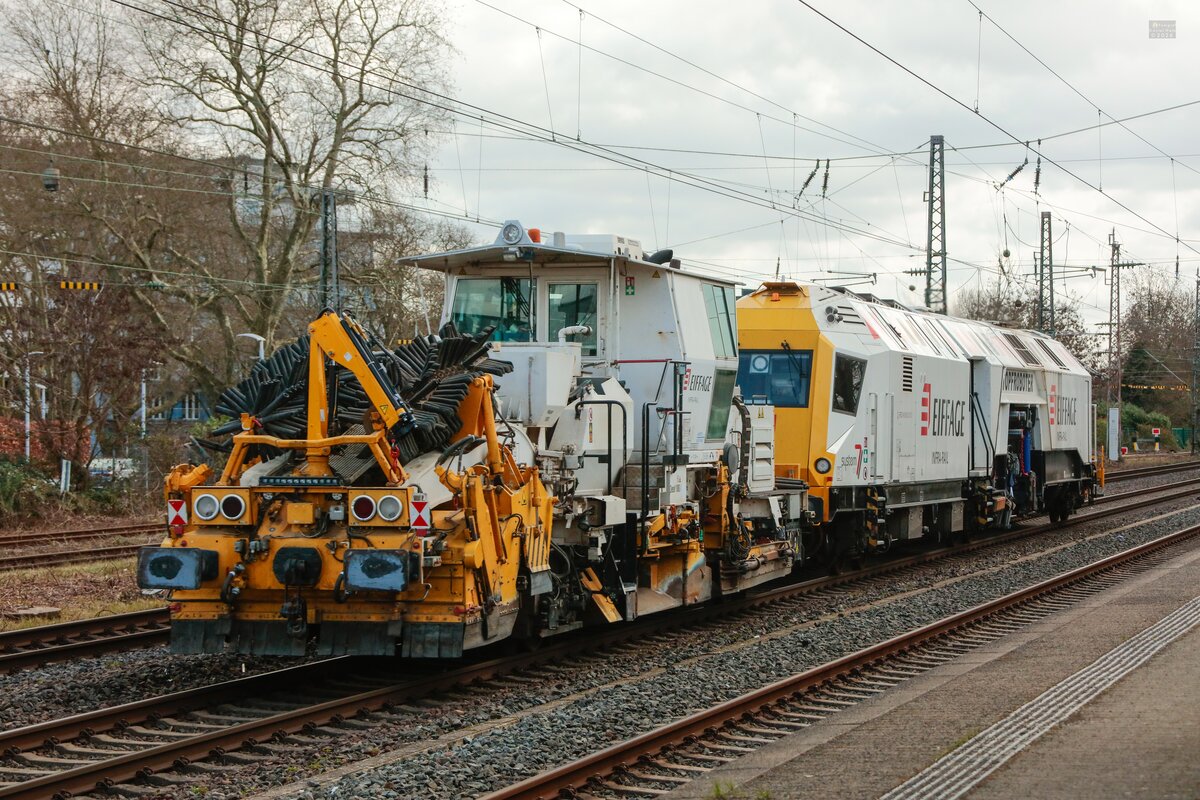 Schotterplanier- und Profilierungsmaschine P&T SSP 110 SW (99 80 9425 005-2 D-BRS) mit einer Hochleistungs-Universal- Nivellier-Richt-Stopfmaschine vom Typ MATISA B 66 UC am Haken der Fa. STRABAG am 18.01.20 Bf. Flughafen Berlin Schönefeld.