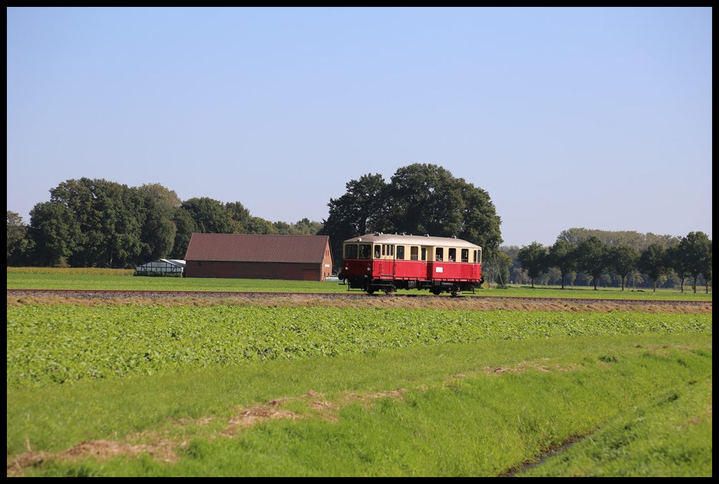 Captrain feierte am 21.09.2024 den 125 Jahrestag des TWE Standortes Gütersloh. 125 Jahre Teutoburger Wald Eisenbahn waren daher der Anlaß für eine kleine Fahrzeugschau im TWE Bahnhof Gütersloh und Pendelfahrten im Personenverkehr zwischen Gütersloh und Marienfeld. Dafür wurde eigens der TWE VT 03, den sonst Eisenbahntradition nutzt, eingesetzt. Hier ist der Triebwagen um 12.36 Uhr kurz vor dem Wendepunkt Marienfeld in der Bauernschaft Oester unterwegs.