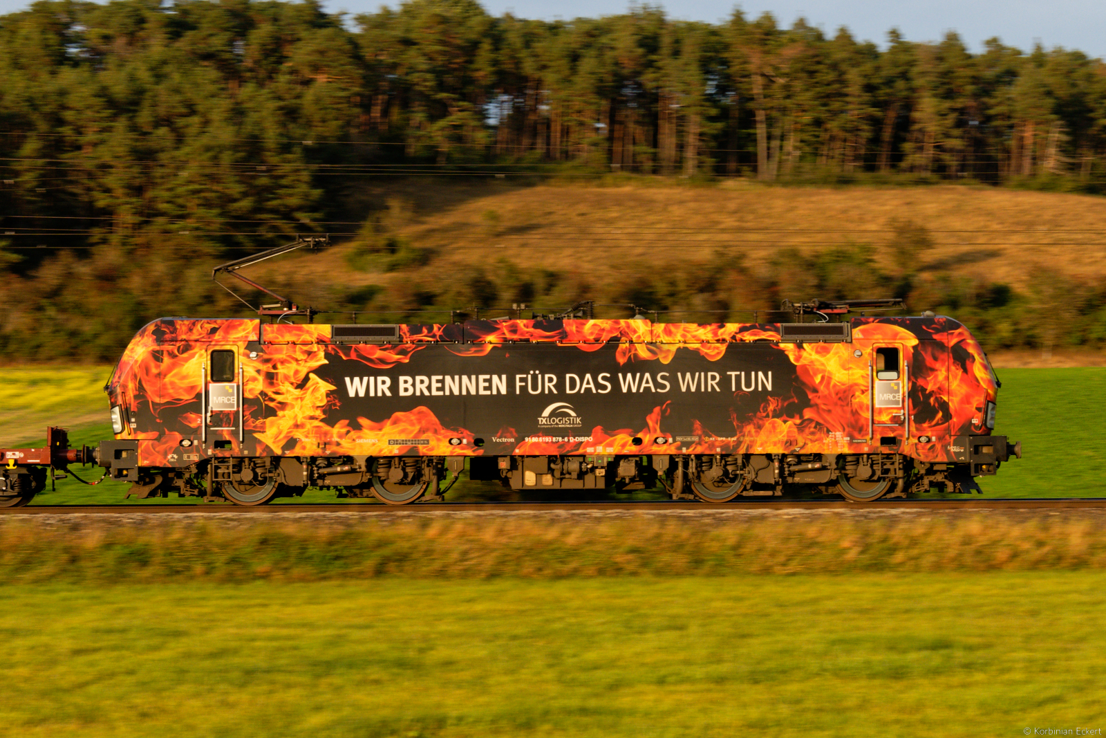 Mitzieher auf 193 878 MRCE/TXL "Wir brennen für das was wir tun" welche mit einem Rungenwagenzug bei Lehrberg Richtung Ansbach unterwegs war, 23.09.2021