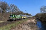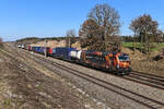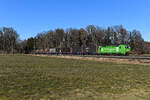 193 996 Railpool/TXL "Ökologik - keine Füße, kein Abdruck" mit einem LKW-Walter KLV-Zug bei Hagenbüchach Richtung Würzburg, 09.03.2022