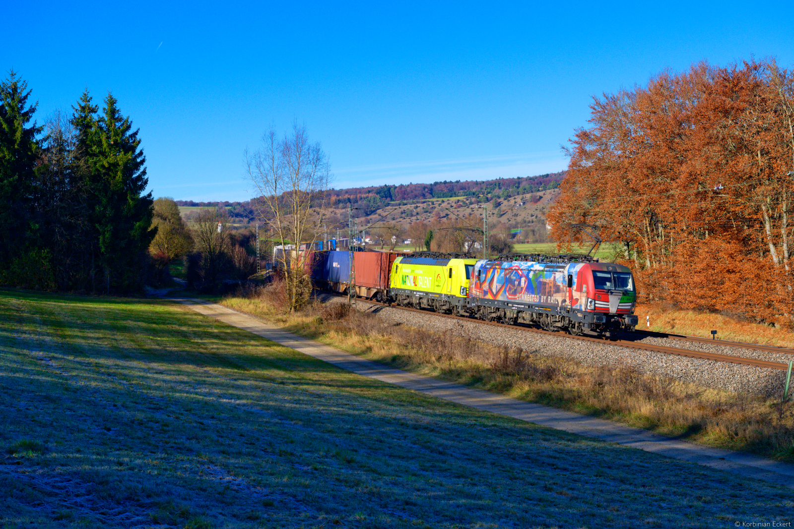 193 550 ATLU/TXL  TX Logistik & AlphaTrains - Zwei Pole mit ernomer Zugkraft  mit einem KLV-Zug bei Dollnstein Richtung Ingolstadt, 23.11.2021