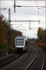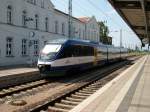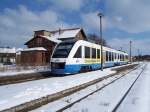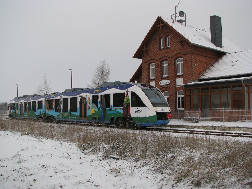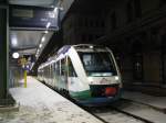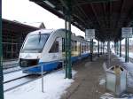 VT 702 der Ostseeland Verkehr GmbH kurz vor der Abfahrt im Bahnhof von Rehna nach Parchim über Schwerin Hbf und Crivitz am 03.12.2010