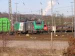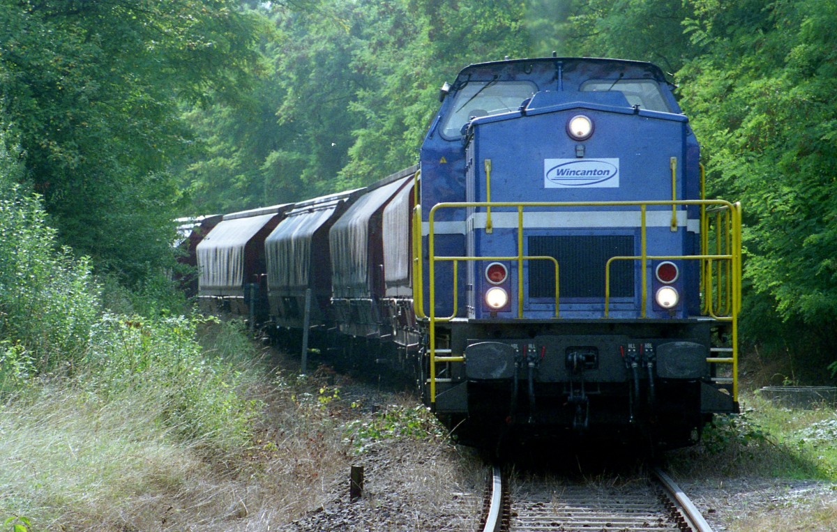 Im Jahr 2009 gab es letztmals Transporte von losem Zucker per Bahn aus Offstein (Pfalz) nach Antwerpen. Die Wincanton-Rail übernahm dabei den Transport von Neuoffstein über Gründstadt bis nach Worms. Das Bild zeigt einen Zug im Spetember 2009 zwischen Offstein und Gründstadt. Nikon F-301 - Scan vom Negativ. Jörg Ohlhaver