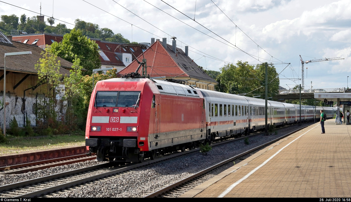 101 027-1 mit Schublok 101 123-8 als umgeleiteter IC 1269 (Linie 60) von Karlsruhe Hbf nach München Hbf durchfährt den Bahnhof Asperg auf der Bahnstrecke Stuttgart–Würzburg (Frankenbahn | KBS 780).