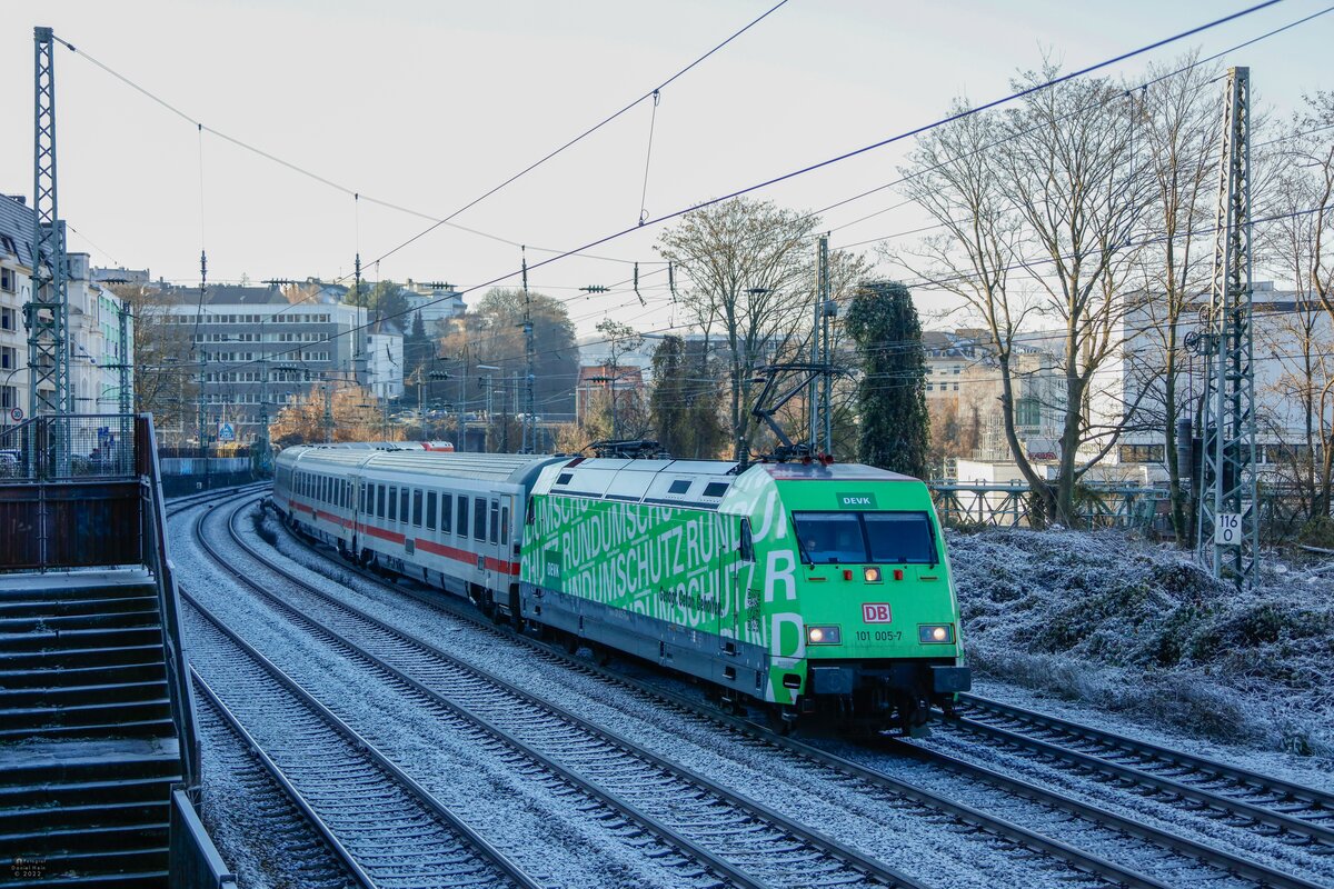 DB 101 005-7  DEVK  mit IC2049 in Wuppertal, Dezember 2022.