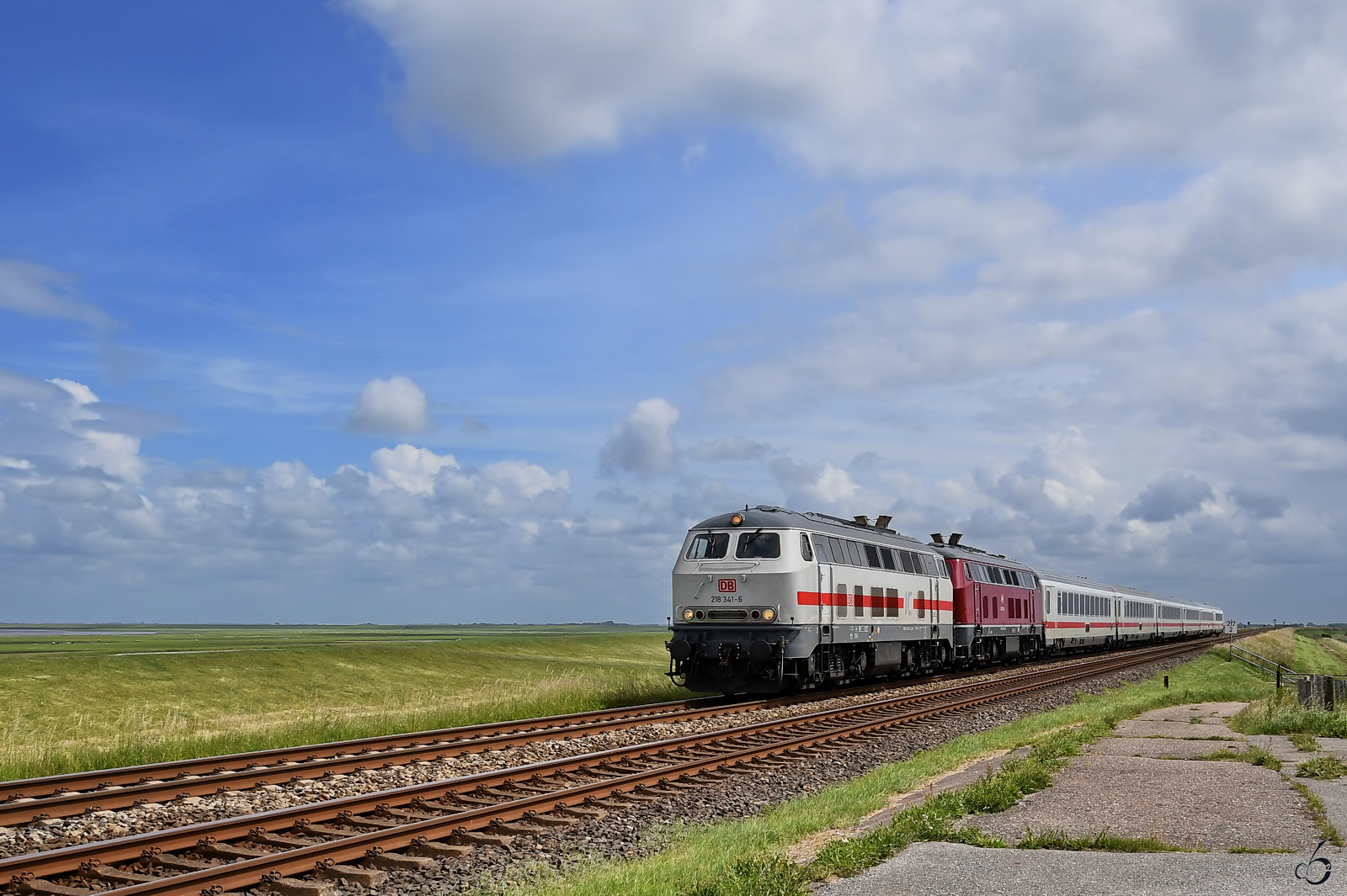 Anfang Juni 2024 zog die Diesellokomotiven 218 373-9 und 218 341-6 einen IC-Zug und ist hier bei Friedrich-Wilhelm-Lübke-Koog zu sehen.
