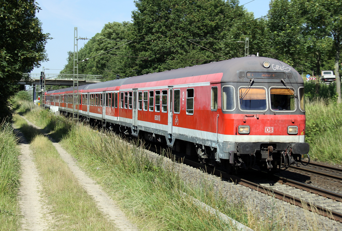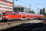 111 020-4 schiebt einen Kalrsruher Steuerwagen auf dem RE4 Verstärker von Düsseldorf nach Aachen in Geilenkirchen am 03.07.2014