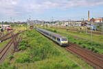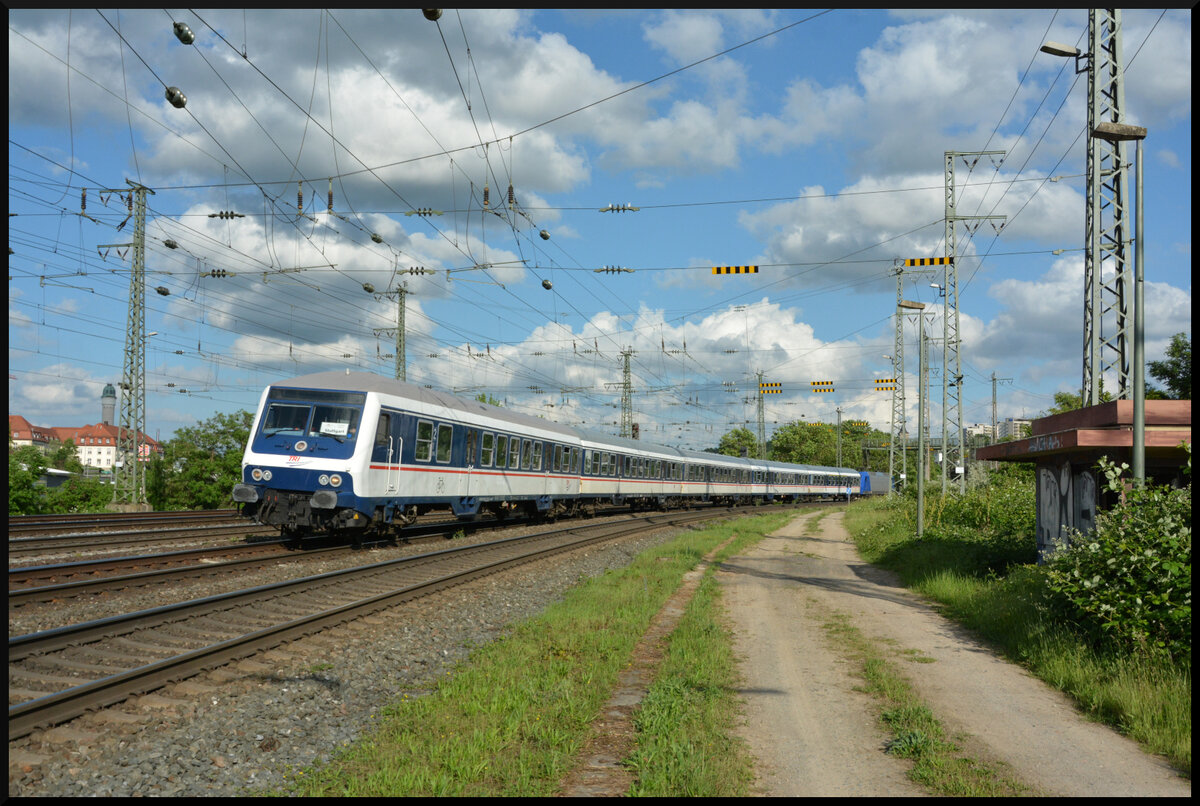Seit eineinhalb Jahren fährt Train Rental International (TRI) für GoAhead Baden-Württemberg Ersatzverkehr auf dem RE8 Würzburg - Stuttgart. Zweimal täglich, vormittags und abends, kommt dabei der TRI-Ersatzzug nach Würzburg. Am Abend des 22.05.2024 rollt die Fuhre in den Würzburger Hbf.