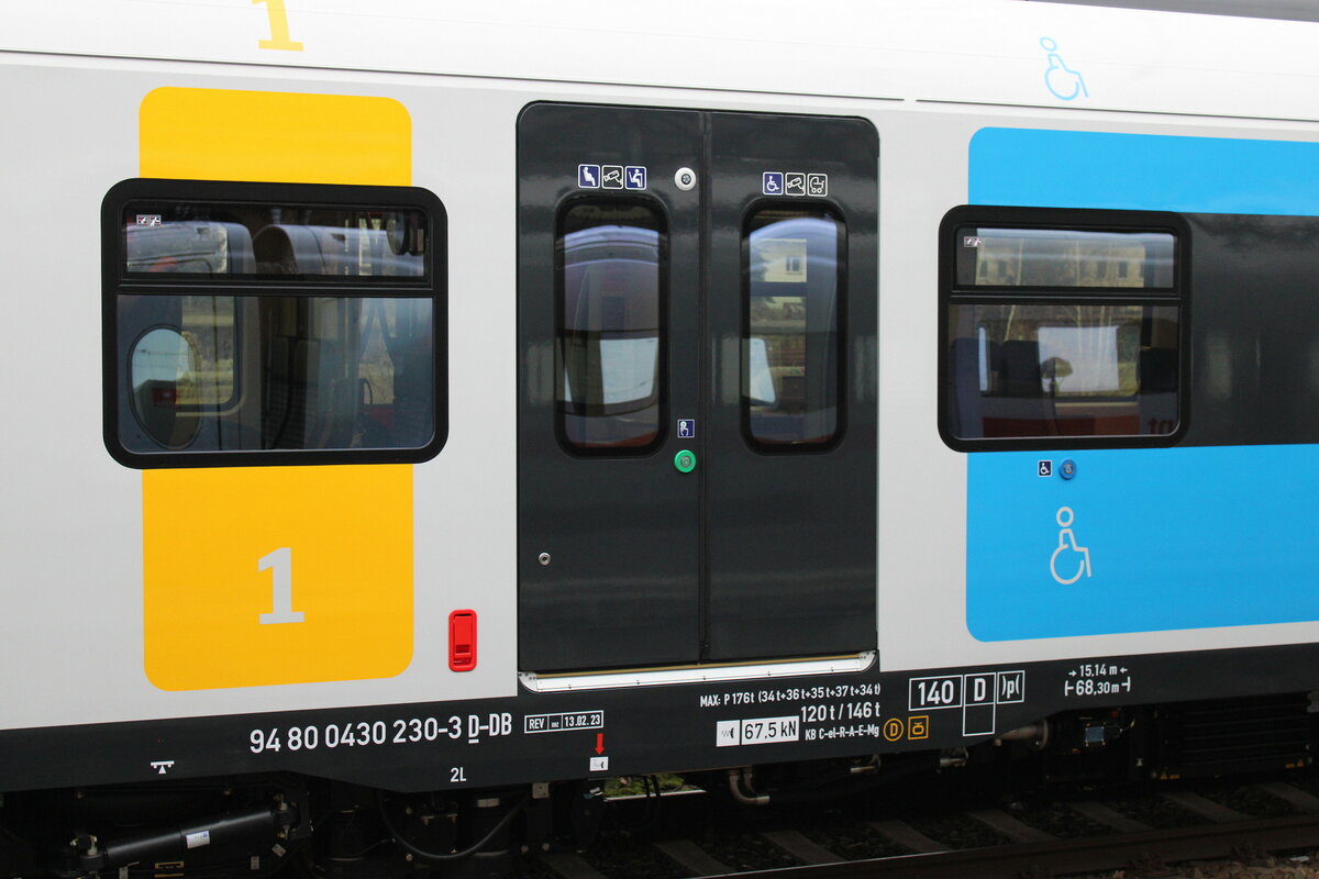 Die 1. Tür des DB S-Bahn Stuttgart 430 230 während der Abnahmefahrt am 13.02.2023 in Riesa.