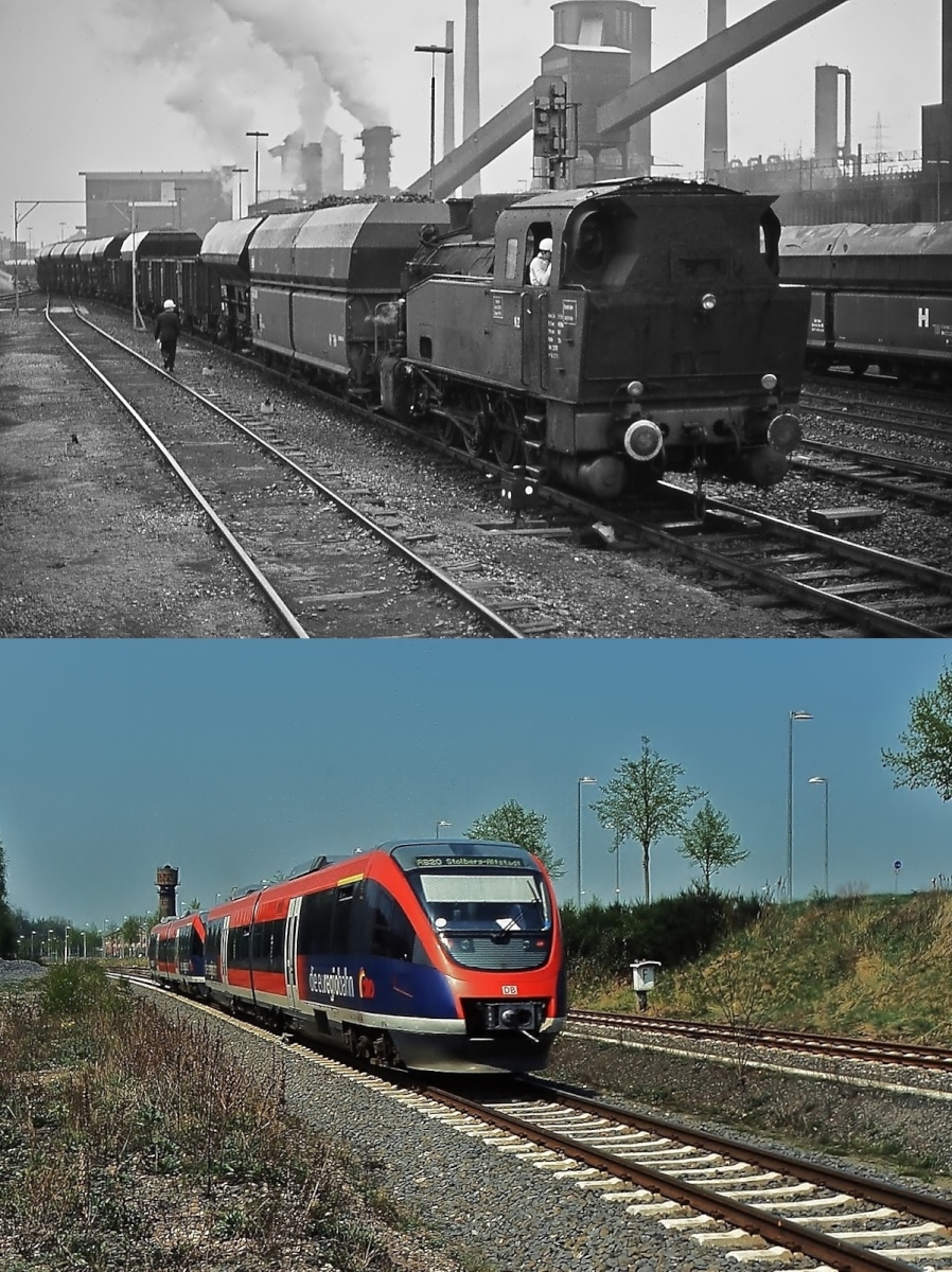Die Zeche Anna in Alsdorf bei Aachen einst & jetzt: Manchmal sind die zwischenzeitlichen Veränderungen schon ganz schön brutal, denen man beim Versuch, Einst&Jetzt-Aufnahmen zu machen, gegenübersteht. Ende der 1970er Jahre war die Zeche ein beliebtes Ziel für Eisenbahnfreunde, da dort noch Dampfloks eingesetzt wurden. Auf dem oberen Bild aus dem Frühjahr 1979 bilden die imposanten Anlagen der Kokerei den passenden Hintergrund für Anna No. 2, auf dem unteren Bild fährt ein 644 im Sommer 2008 aus Herzogenrath ein. Auf dem früheren Zechengelände befindet sicher heute der Anna-Park. Hier war es schwierig, zumindest den ungefähren früheren Fotostandpunkt wiederzufinden, Anhaltspunkt waren die Gleislage und die Reste der früheren Landerampe.
