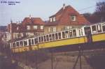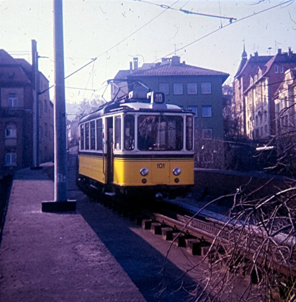 1982 fuhren auf der Zacke, wie die Linie 10 genannt wurde, noch die alten Triebwagen. Hier Wagen 101 kurz hinter der Ausfahrt am Marienplatz. Hinweis: eingescanntes Dia