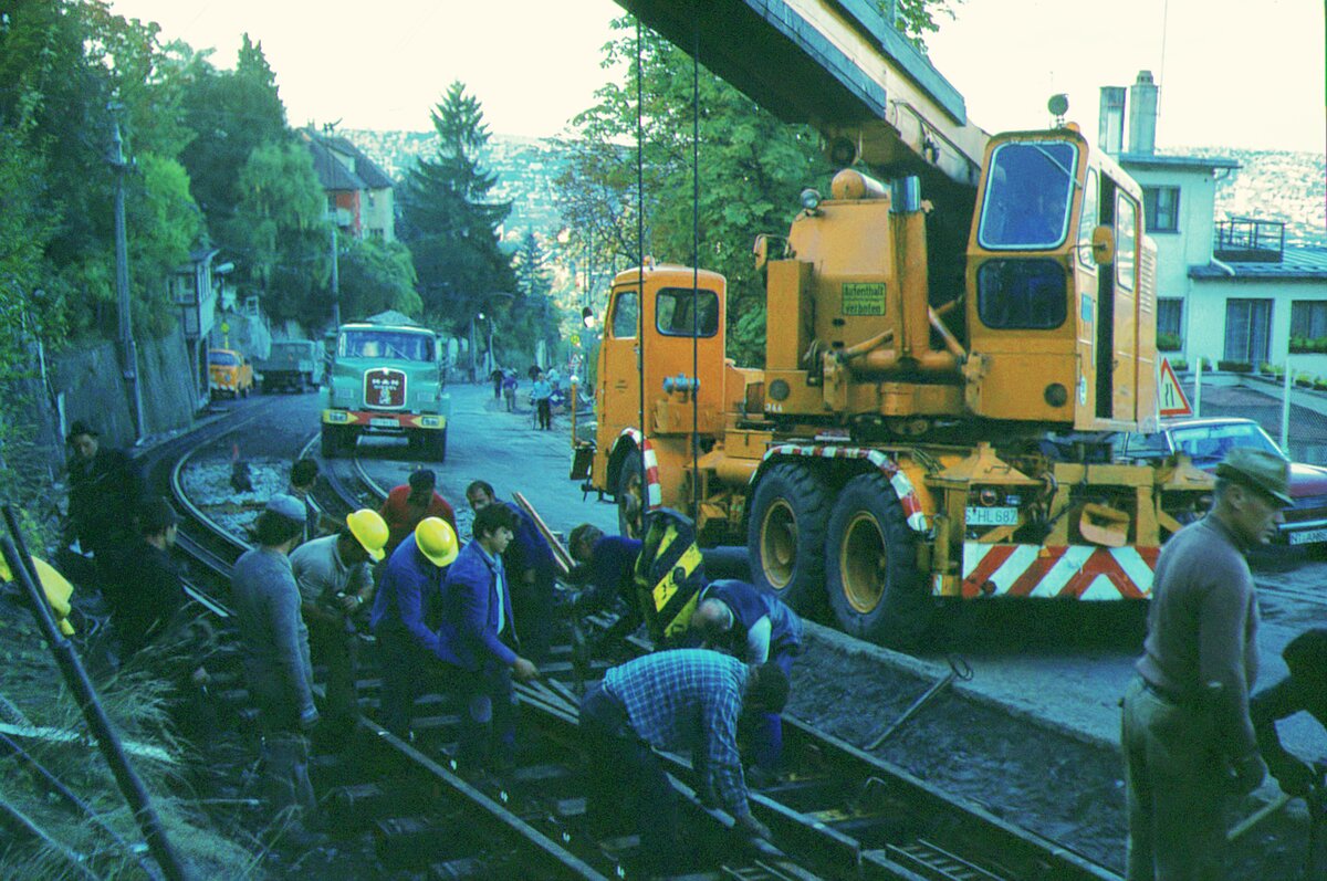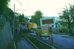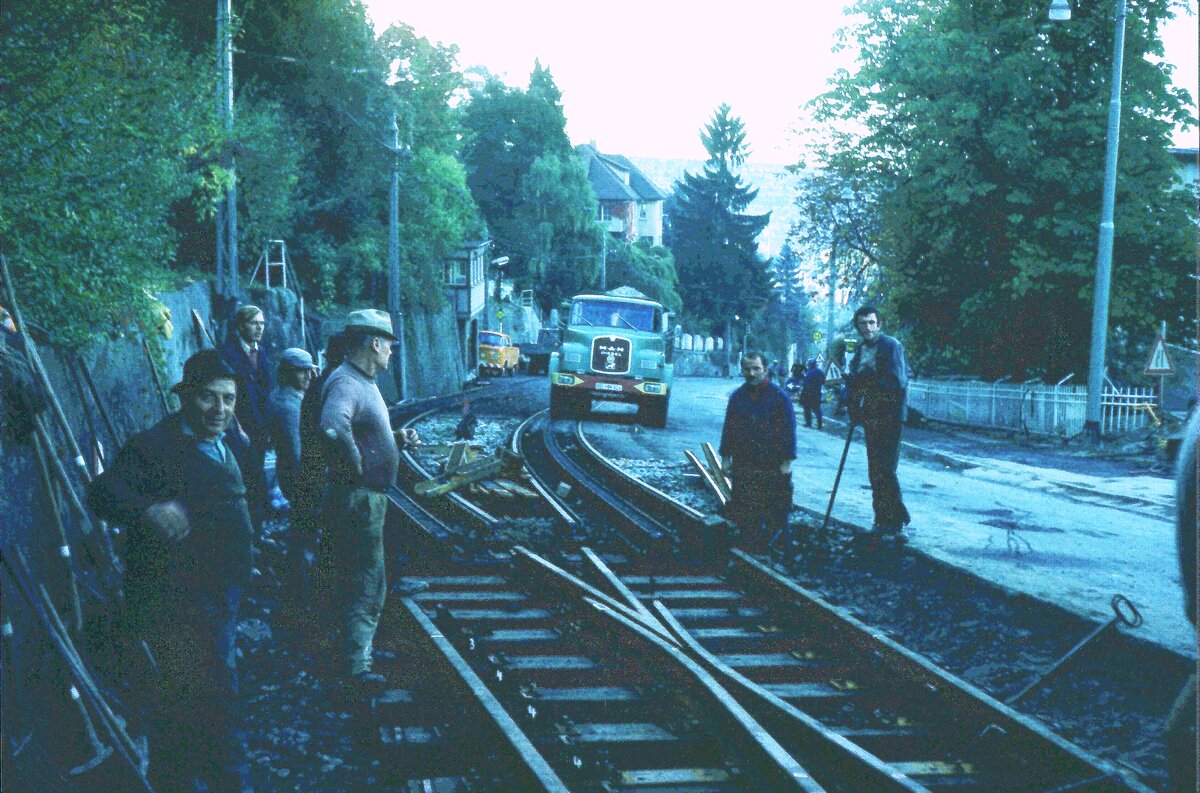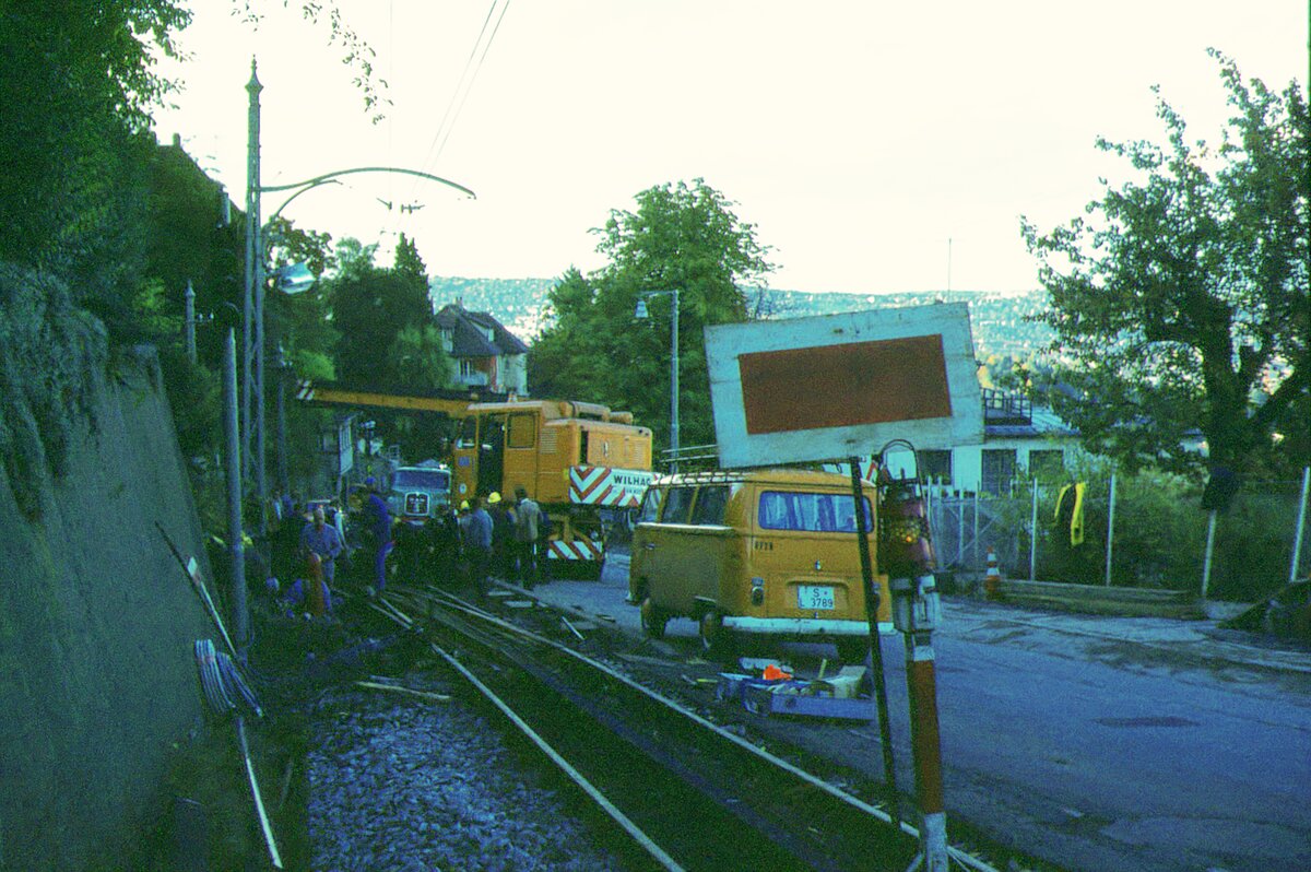 Das Foto zeigt, wie ich mir bei der Sonderfahrt der Stuttgarter Straßenbahnen vom 31.05.1984 einen Platz als Fotograf "erkämpfen" musste! Über der historischen Straßenbahn (TW 418 und Nachbaubeiwagen 1241) fährt ein Zug der Zahnradbahn mit TW 104 und Vorstellwagen 120 über die Brücke der Neuen Weinsteige. Leider ist eine solche Begegnung schon längst Vergangenheit, die Straßenbahn wurde durch die Stadtbahn abgelöst und historische Züge auf der Zahnradbahn sind auch nur noch in der Zahnradbahnliteratur zu finden.