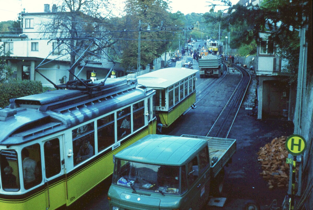 Das Foto zeigt, wie ich mir bei der Sonderfahrt der Stuttgarter Straßenbahnen vom 31.05.1984 einen Platz als Fotograf  erkämpfen  musste! Über der historischen Straßenbahn (TW 418 und Nachbaubeiwagen 1241) fährt ein Zug der Zahnradbahn mit TW 104 und Vorstellwagen 120 über die Brücke der Neuen Weinsteige. Leider ist eine solche Begegnung schon längst Vergangenheit, die Straßenbahn wurde durch die Stadtbahn abgelöst und historische Züge auf der Zahnradbahn sind auch nur noch in der Zahnradbahnliteratur zu finden.