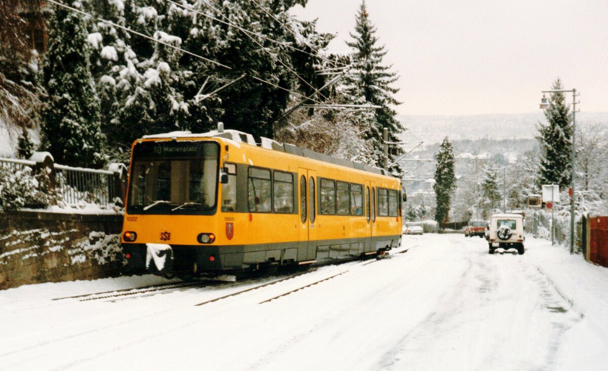 SSB Stuttgart__Zahnradbahn Tw 102 [ME 1935] auf einem der "Schrottgleise" im Bf S-Möhringen. Während die übrigen vier Zahnradbahn-Tw der Baujahre 1935-1950 in den 70er Jahren noch modernisiert wurden und bis 1982 im Einsatz waren, wurde 102 bereits 1973 ausgemustert. Die seltsame Seitenbeschriftung stammt noch vom Einsatz im Stuttgarter Faschingsumzug im Februar 1974, bei dem Tw 102 Werbung für die SSB machte. Das vollständige Motto hieß: "AUCH REICHE SCHEICHE FAHREN SSB", was Bezug nahm auf die vier bundesweiten Sonntagsfahrverbote für MIV Nov./Dez. 1973.(Grund für die Fahrverbote war eine plötzlich akute Ölknappheit, ausgelöst durch den Nahostkonflikt und das von der OPEC verhängte Öl-Embargo).__07-03-1974 Klaus-Erich Lisk