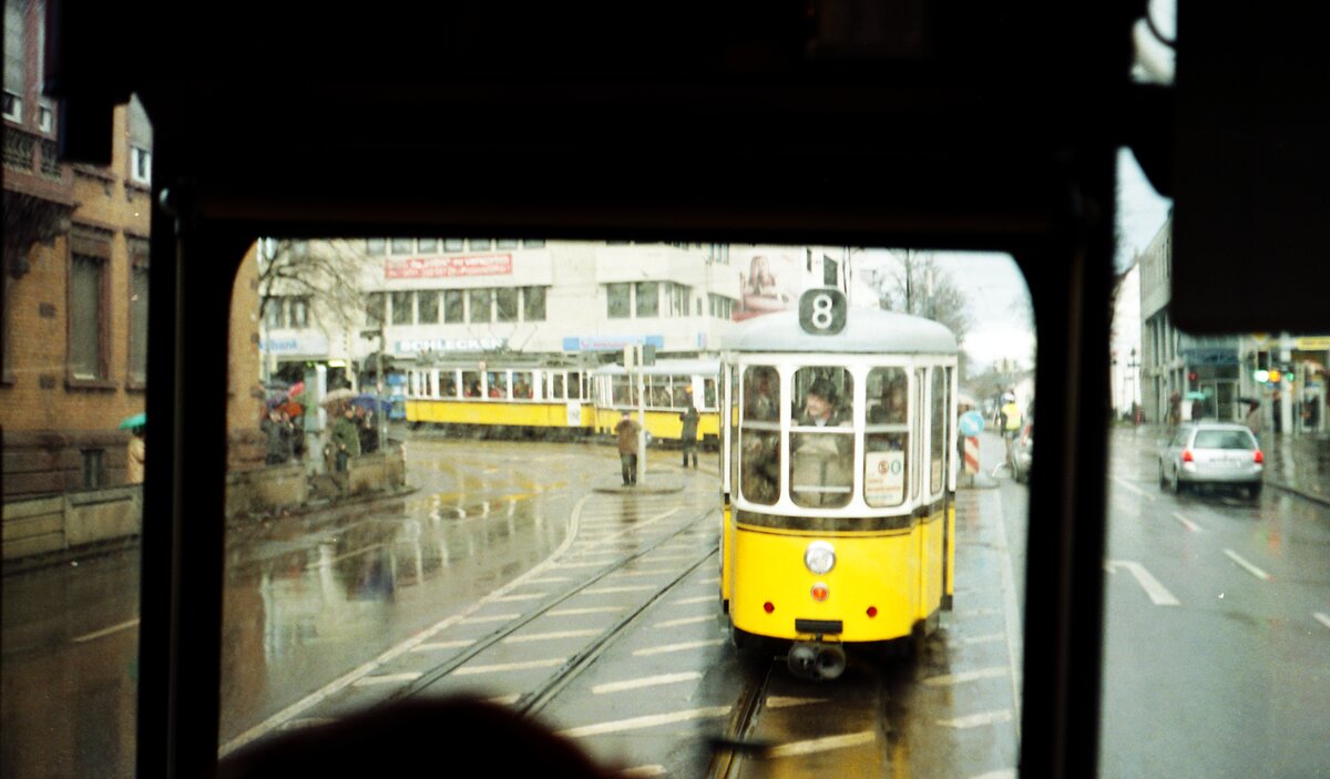 Noch eine Begegnung der besonderen Art: TW 104 mit Vorstellwagen 120 auf der Brücke der Stuttgarter Zahnradbahn über die Neue Weinsteige. Darunter ein historischer Straßenbahnzug mit TW 418 und Beiwagen 1241. Das Foto entstand am 31.05.1984.