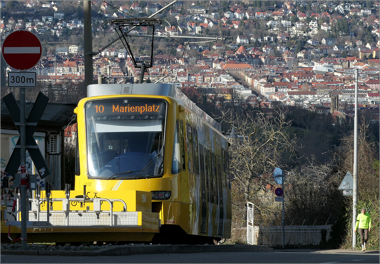 Nachmittags oft im Schatten fährt die Zacke hinab in den Stuttgarter Talkessel. Unterhalb der Haltestelle Haigst fällt etwas Sonnenlicht auf die Bahn.