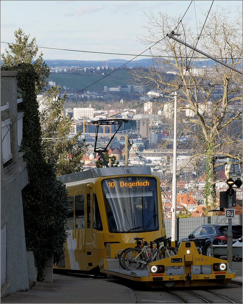 ... die den 'Güterwagen' schiebt. Ankunft des Stadler Zahnradbahnwagen 1102 an der Haltestelle Haigst in Stuttgart-Degerloch.