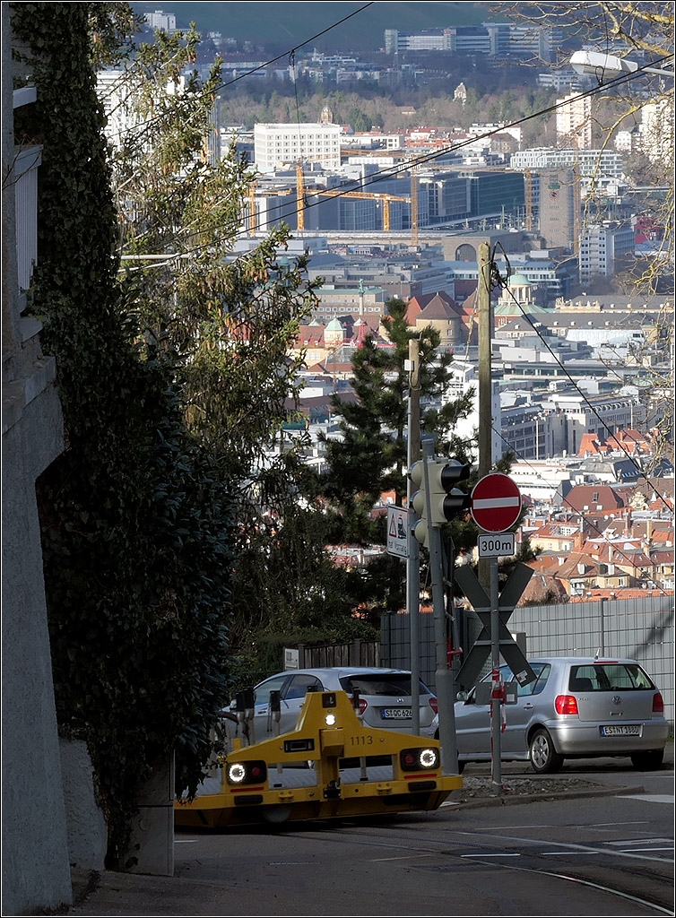 ... kommt da um die Ecke. An der Haltestelle Haigst der Stuttgarter 'Zacke' mit dem Hauptbahnhof und seinen Baukränen im Hintergrund.