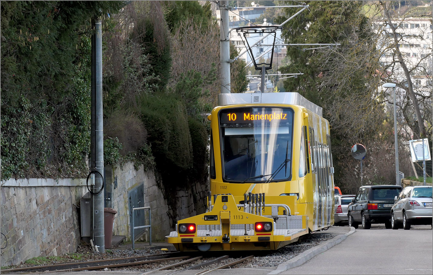 ... rollt die Stadler-Zahnradbahn mit ihrem Fahrradwagen. Standort unterhalb der Haltestelle Wielandstraße.