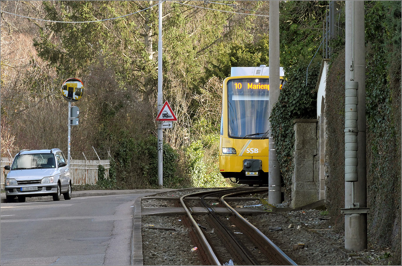 Eine Stadler-Zahnradbahn kommt in Stuttgart die Alte Weinsteige herunter. Man beachte auch den Spiegel links.