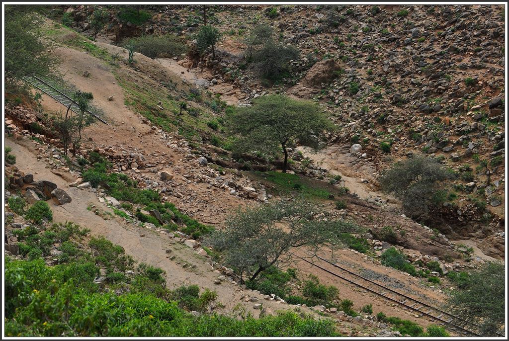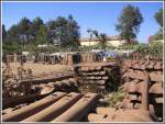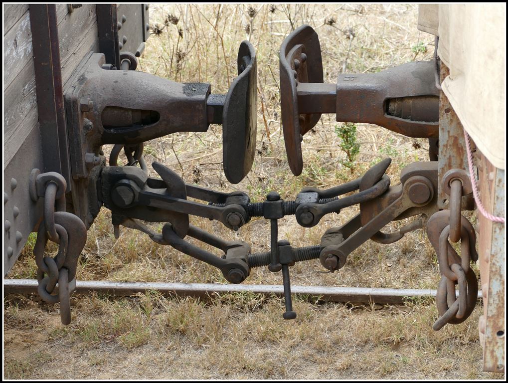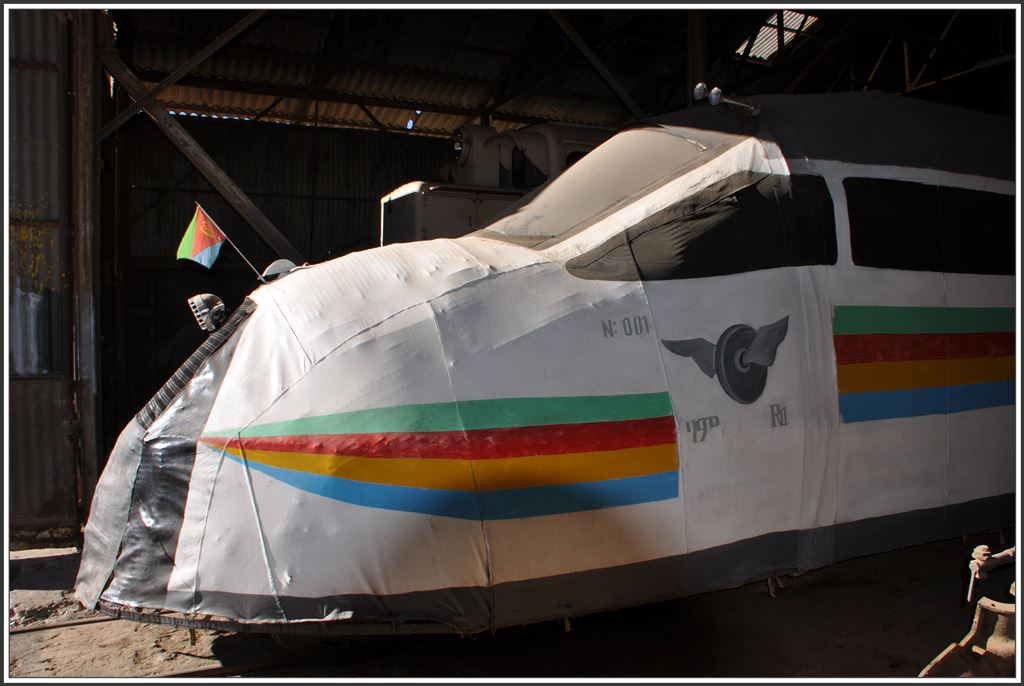 ICE 001 der ER? Unter der Stoffblache befindet sich ein Güterwagenuntergestell, darauf ein Fahrersitz mit Gangschaltung und ein Motor, der irgendwie das komische Gefährt antreibt. Depot Asmara (04.12.2014)