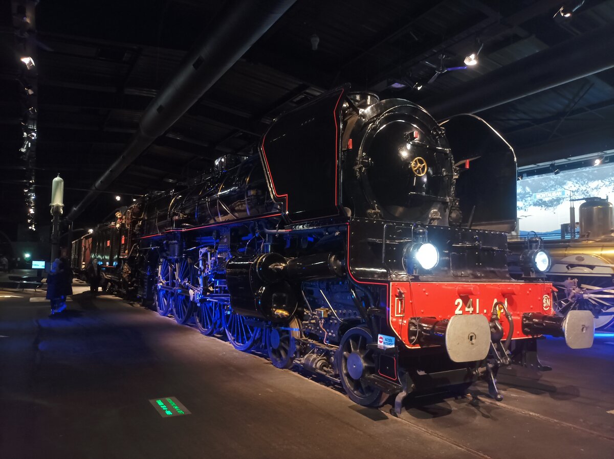 241 A1 steht am 10. Juli 2024 im Cité du Train Mulhouse. Das Triebwerk wird von einem blauen Licht beleuchtet.