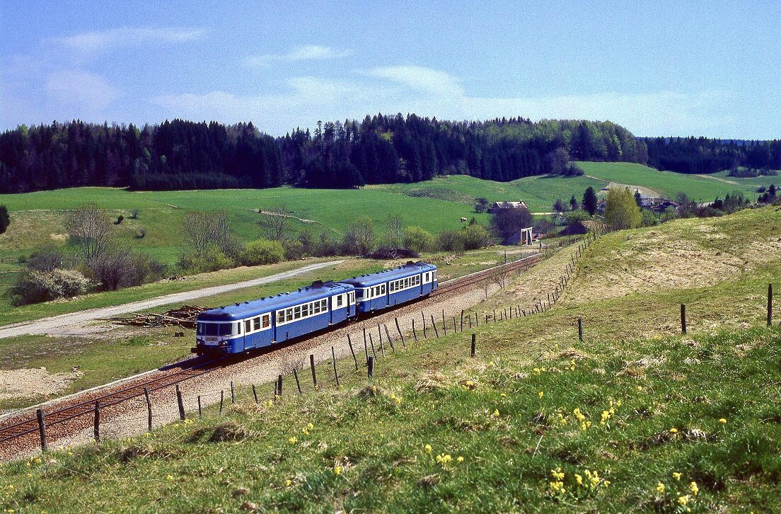 Der SNCF X 2816 - der Dieseltriebwagen ist mit dem dahinter verstecken X 2869 von von Dôle Ville nach St-Claude unterwegs und sind nun in Morez angekommen, wo der Zug die Fahrtrichtung wechselt. Variante eines bereits gezeigten Analogbild mit etwas mehr Umfeld.