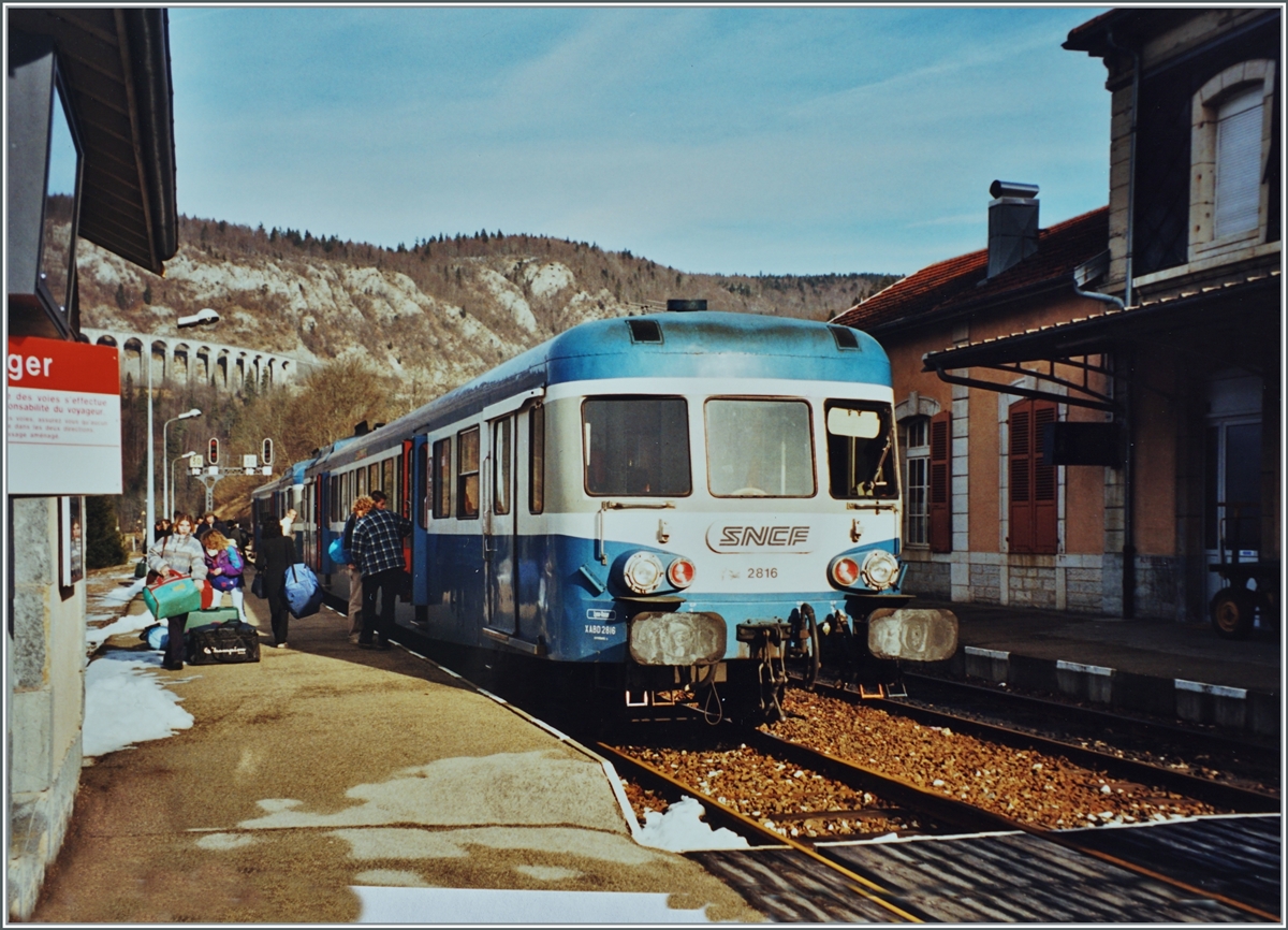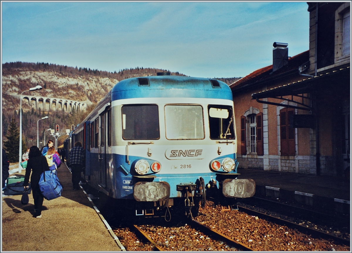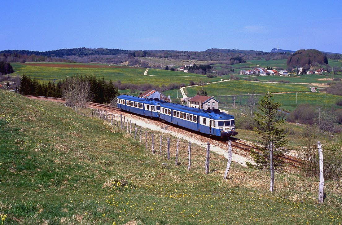 Die Ligne des Hirondelles erreicht bei etwa 948 Metern Höhe ihren höchsten Punkt im Jura am Col de la Savine. Danach geht es ganz steil abwärts, wie im Bild zu sehen. 30.Juni 2015. Durch das verglaste Führerstandrückfenster.