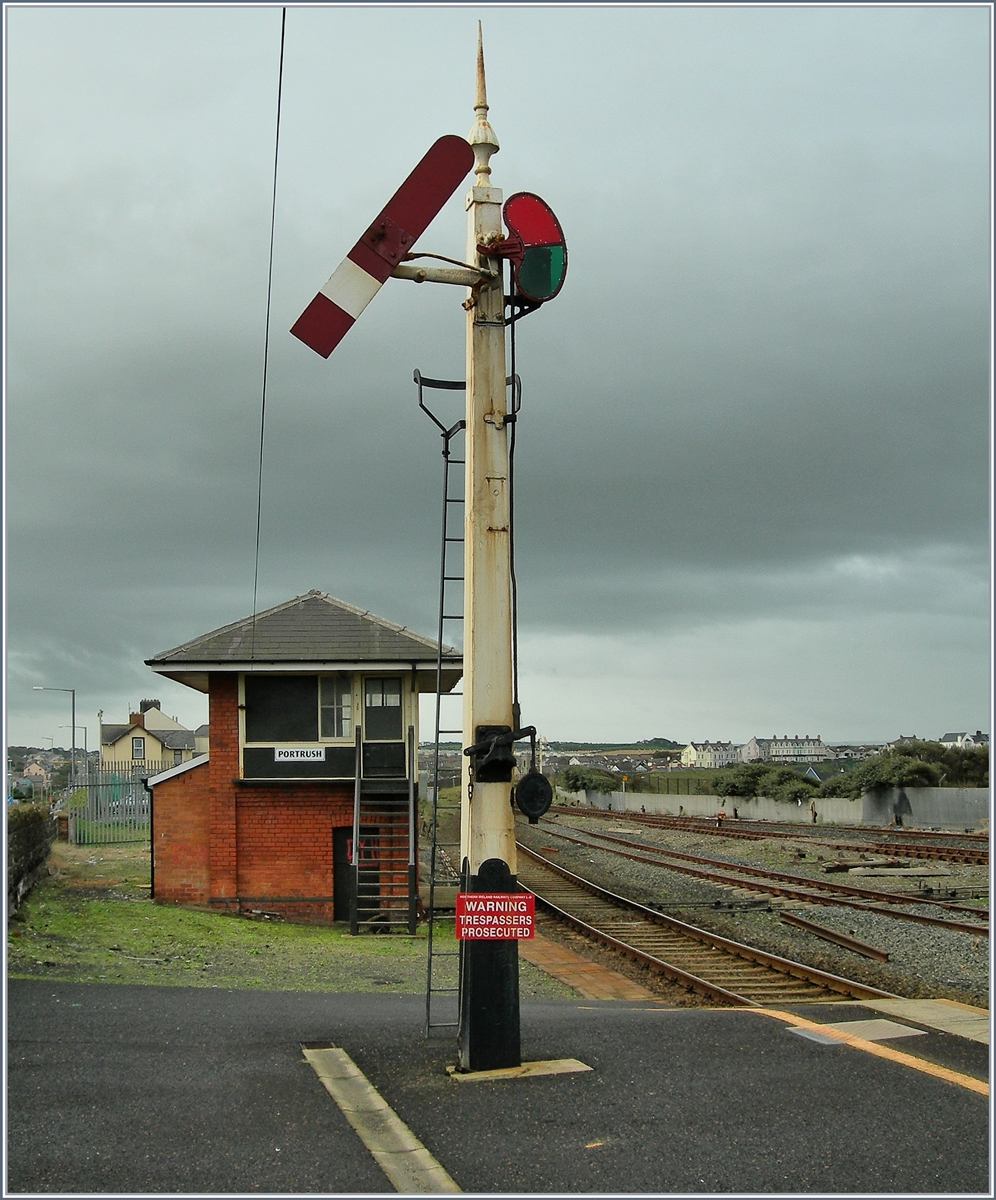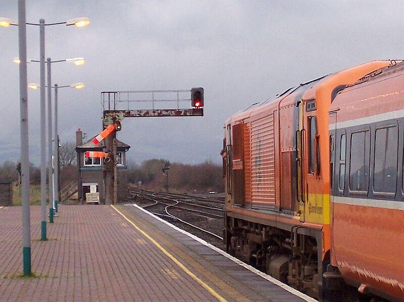 7 Formsignale, davon 1 Zwei-Flügel-Signal, am 16.02.2005 in Limerick Junction. Die linke, eingleisige Strecke führt nach Limerick - Ennis, die rechte, zweigleisige Strecke nach Kildare - Dublin Heuston.