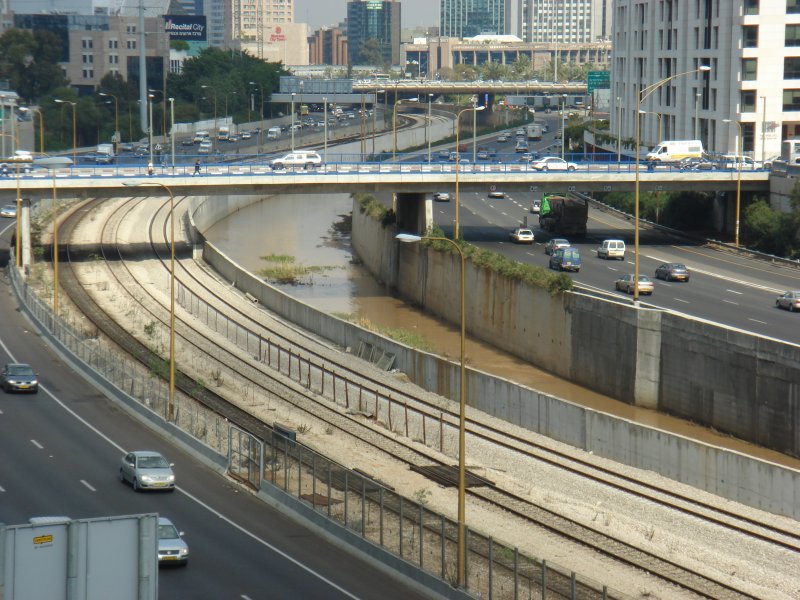 Die "Stadtbahn" von Tel Aviv. Hier entlang verläuft der gesamte Nord-Süd-Verkehr Israels, durch dieses Nadelöhr müssen alle Züge und alle 2 km ist ein Bahnhof. Eine Güterzugumgehungsstrecke ist in Planung, aber bis zur Realisierung wird noch etwas Wasser durch den parallelen Ayalon Kanal fließen. Der Blick geht Richtung Tel Aviv Zentrum. (Tel Aviv, 07.02.2007)