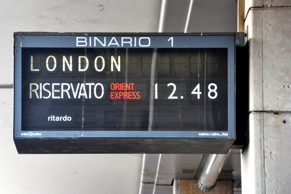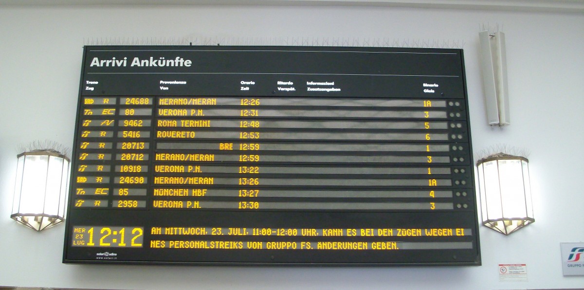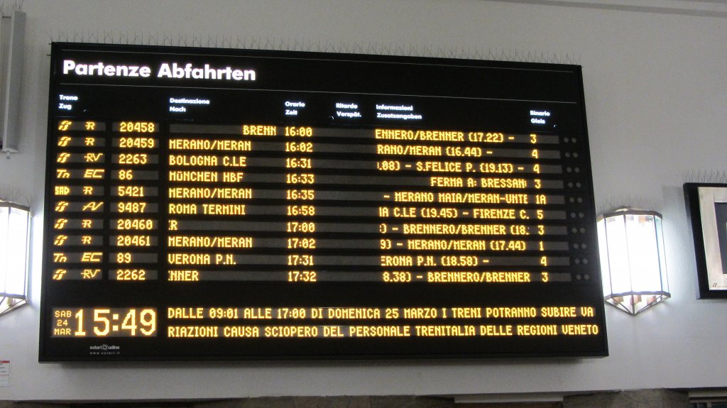 Abfahrtsmonitor im Bahnhof Pontebba am 25.10.2015.