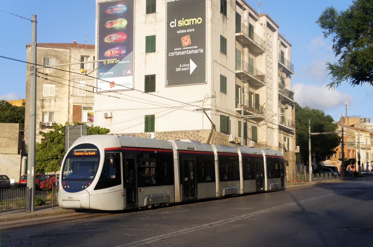 Italien / Sardinien / Straßenbahn Sassari / Stadtbahn Sassari: AnsaldoBreda Sirio mit der Wagennummer SS02, aufgenommen im Juni 2014 am Piazza Santa Maria, in der Nähe der Haltestelle "Porta Utzeri" in Sassari. N8Express