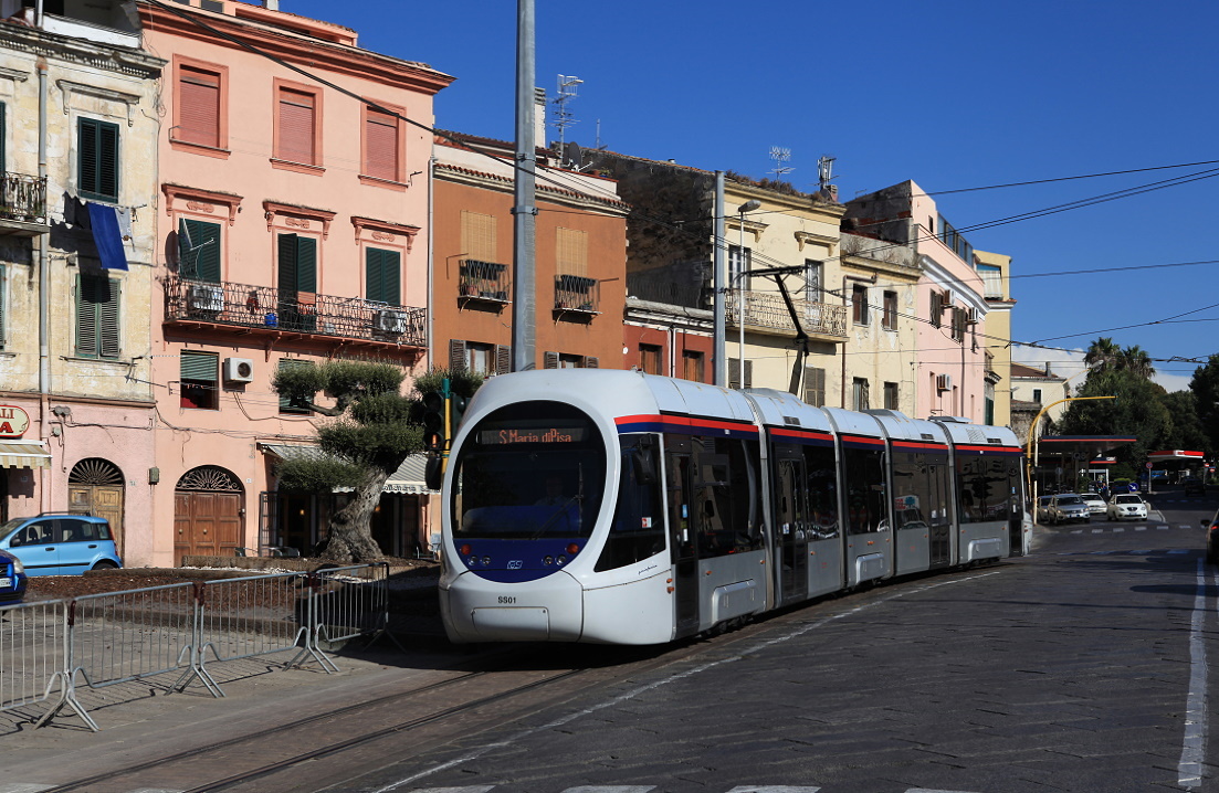 Italien / Sardinien / Straßenbahn Sassari / Stadtbahn Sassari: AnsaldoBreda Sirio mit der Wagennummer SS01, aufgenommen im Juni 2014 am Piazza Santa Maria, in der Nähe der Haltestelle "Porta Utzeri" in Sassari. N8Express