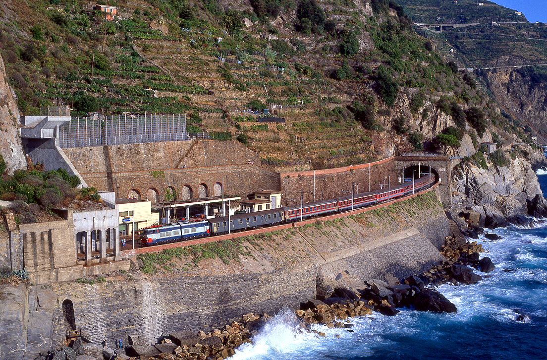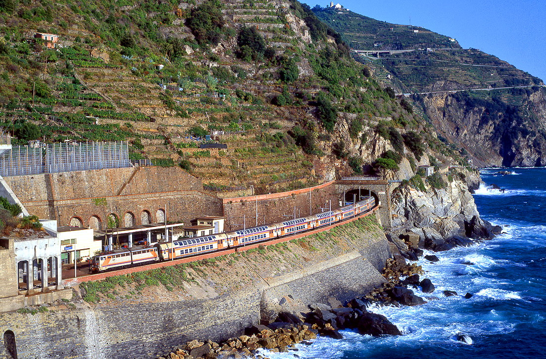 Meiner Meinung nach ein ganz heisser Anwärter für den Bahnhof an der schönsten Lage der Welt: Manarola in der Cinque Terre. Der Fahrgastwechsel ist beendet, der 5 Terre Express von La Spezia nach Levanto fährt ab. Manarola, 26.4.2023