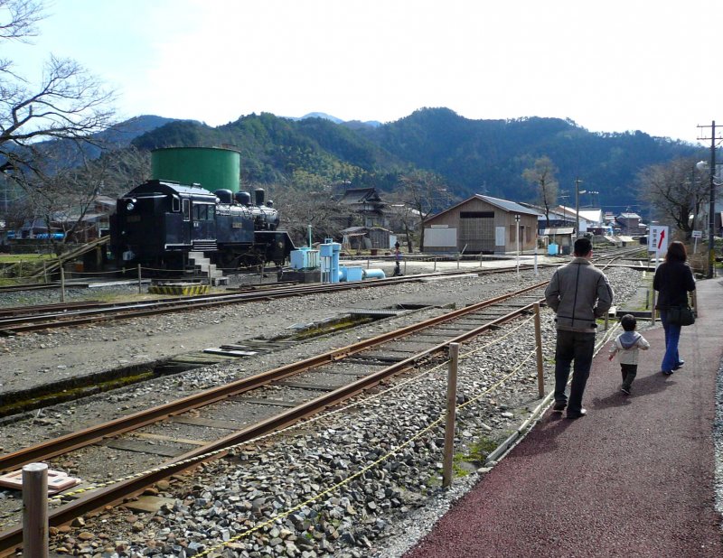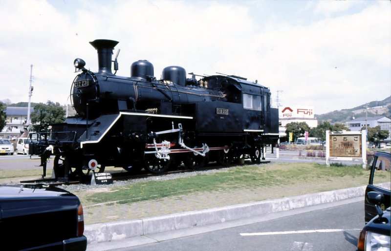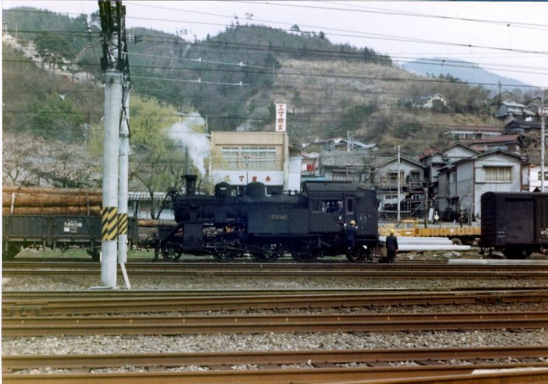 C12 (Achsfolge 1C1): Diese Loks wurden für Strecken mit sehr leichtem Oberbau 1932-1940 und 1947 erstellt. Total 293 Loks. Viele gelangten nach China, dann Vietnam, andere nach Taiwan, Java und auf Sachalin. Hier rangiert die C12 164 einen Güterzug in Agematsu im Kiso-Tal, 14.April 1973.