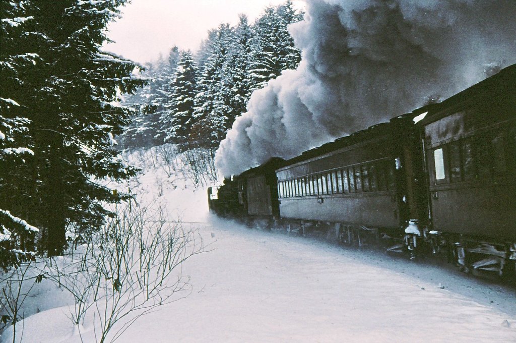 C55 57 wartet in Ryûgamizu ganz im Süden der Südinsel Kyûshû einen Gegenzug ab. Jenseits der Meerenge erhebt sich die grosse aktive Vulkan Sakurajima. 11.August 1972.