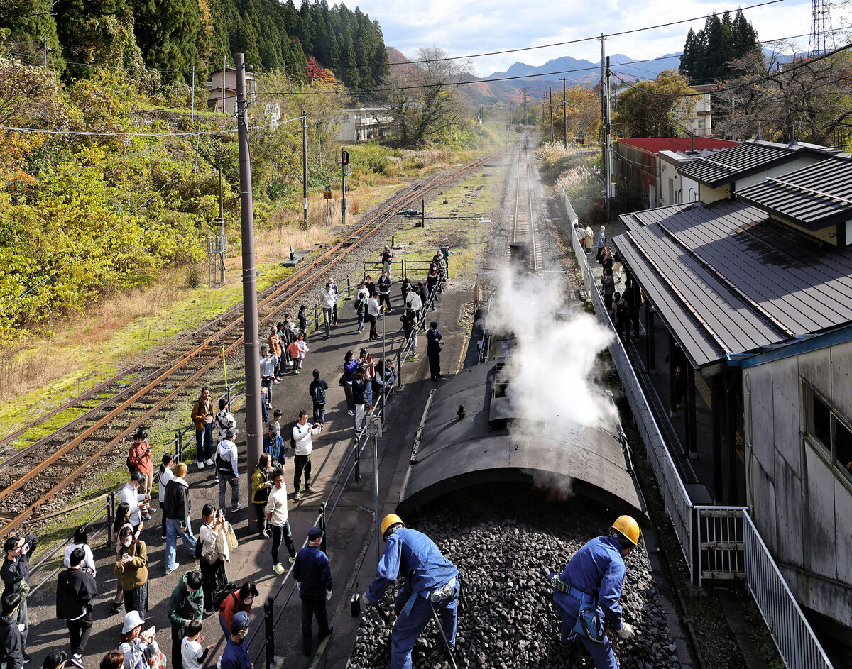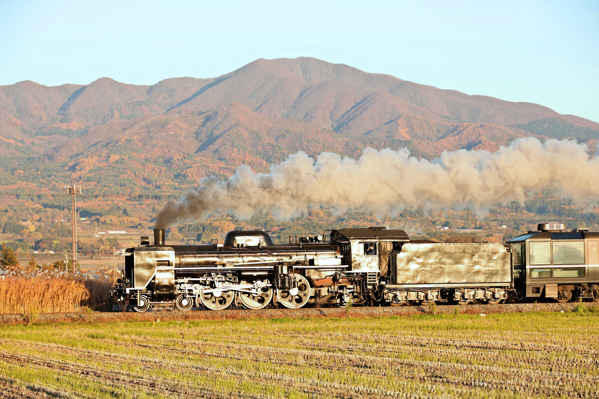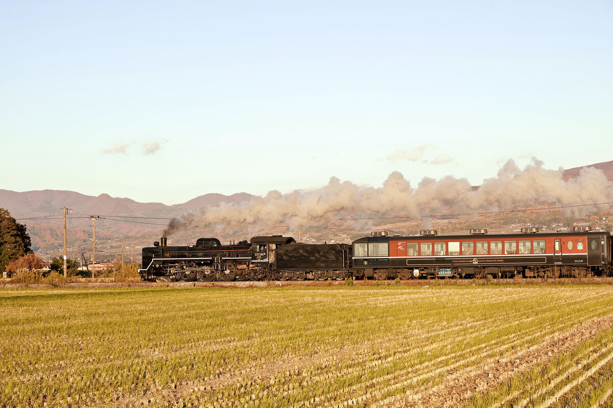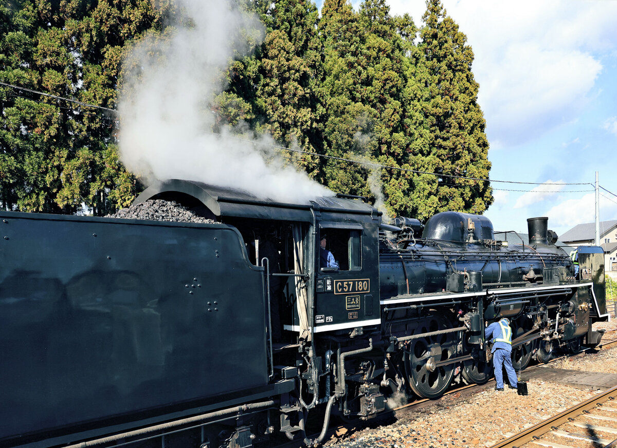 Im letzten Abendlicht und mit leuchtender Stirnlampe gleitet die C57 155 bei Hyûga Kutsukake ganz im Süden der Süd-Insel Kyushu durch die üppige, tiefgrüne Vegetation den Pass herunter Richtung Miyazaki. 13.August 1972.
