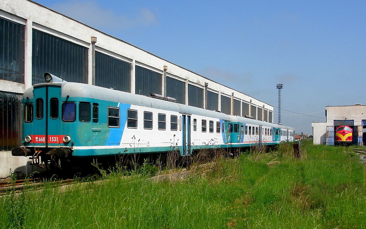 Am 11.10.09 präsentierten sich die ehemaligen italienischen Dieseltriebwagen ALn 668 1531 & 1528 & 1534 neben dem Streckengleis nach Skopje am Rande des BW Fushe Kosove / Kosovo Polje. Die drei Fahrzeuge werden allerdings aufgrund defekter Motoren und mangels Ersatzteilen schon länger nicht mehr eingesetzt und wurden durch vier schwedische Y1 Triebwagen ersetzt. Das BW mussten sie nur verlassen, weil an ihrem Abstellort eine neue Halle entsteht.