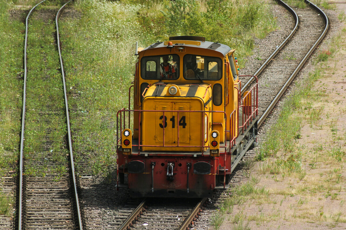 Lok 314 (der zu dieser Zeit Profilarbed S.A. heisenden Unternehmung, die seit 2006 Teil von CFL-Cargo ist). CFL-Cargo ist durch ein Joint-Venture zwischen der CFL und dem Stahlhersteller ArcelorMittal (im Luxemburg vormals ARBED) entstanden. Arcelor/ARBED brachte seine Loks in das neue Unternehmen ein. So auch die hier zu sehende Lok 314 vom Typ MaK-G850 BB. Von dieser Reihe hat die Arcelor/ARBED 18 Stück in die CFL-Cargo eingebracht.