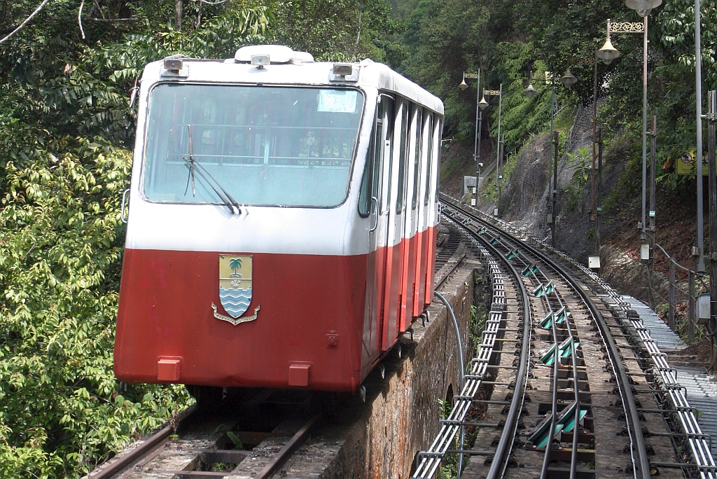 Bei der Modernisierung der KBB (Keretapi Bukit Bendera, Penang Hill Railway) vom 22.Februar 2010 bis 25.April 2011 wurde die Trasse teilweise neu gestaltet und die Züge befahren nun ohne Umsteigen in der Stesen Tengah (Middle Station) die gesamte Strecke. - Im Bild vom 18.Februar 2025 Wagen "Mutiara" der 3.Generation in der zwischen der Stesen Tengah (Middle Station) und der Stesen Claremont neu errichteten Ausweiche.