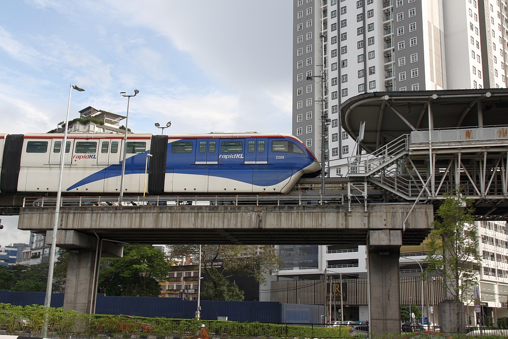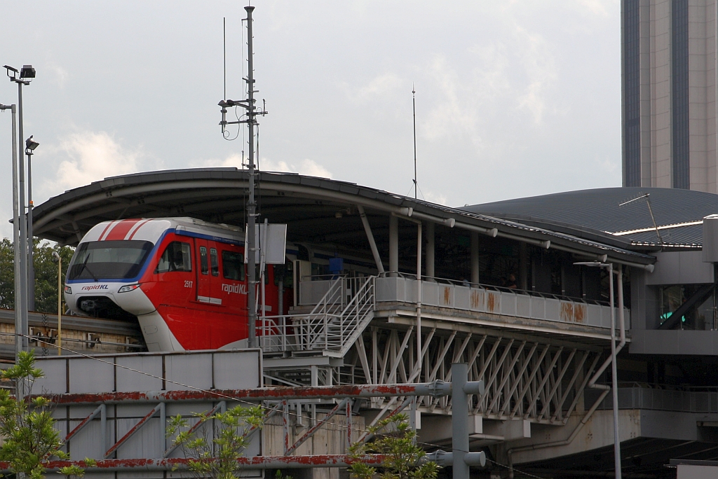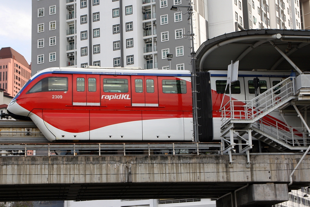 rapidKL Monorail Garnitur 29 mit den Nummern 2933 - 2936 (Hersteller: Scomi Rail, Type SUTRA) hat am 12.Dezember 2023 soeben die Monorail Stesen Titiwangsa (MR11) verlassen.