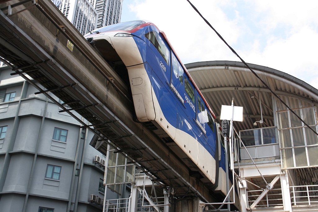 rapidKL Monorail Garnitur 22 mit den Nummern 2205 - 2208 (Hersteller: Scomi Rail, Type SUTRA) am 11.März 2024 zwischen den Stesen's Tun Sambanthan (MR2) und Maharajalela (MR3). Karl Seltenhammer