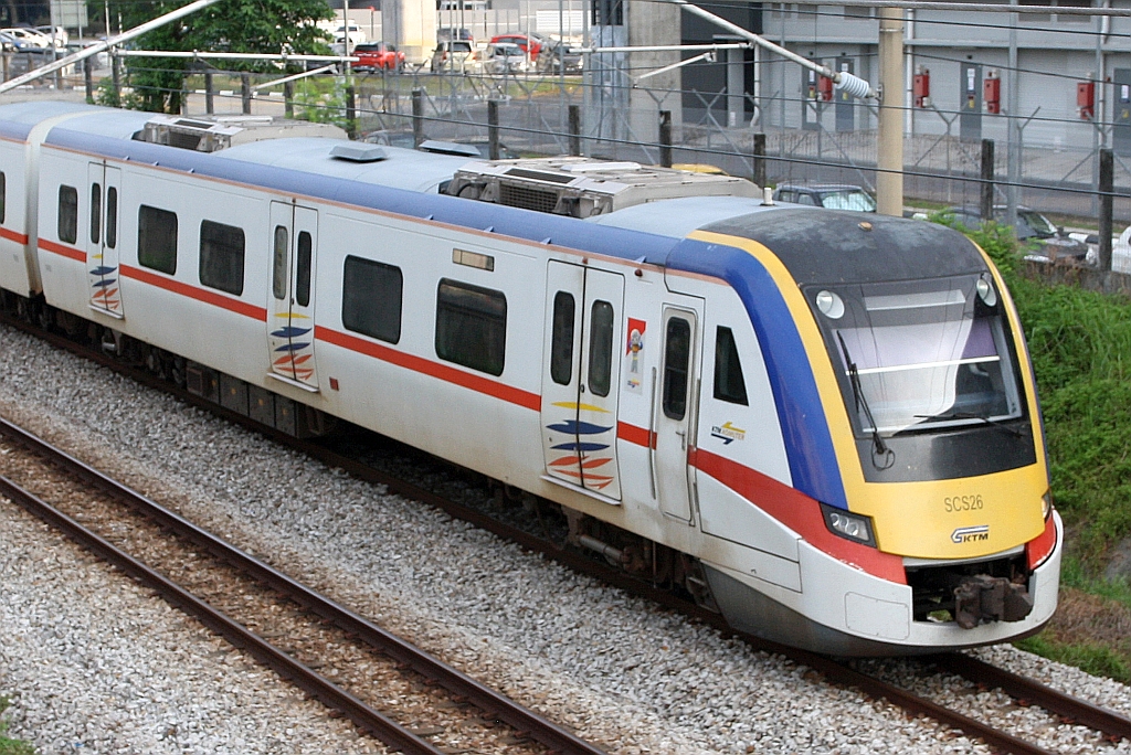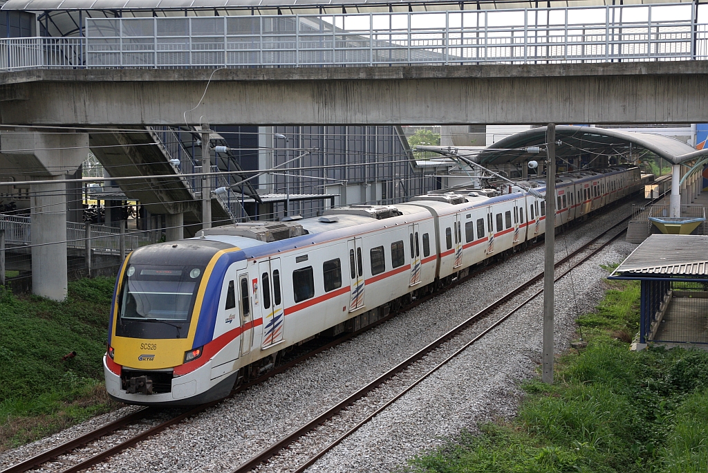 KTM Class 92, Garnitur SCS 26 (Bo′Bo′+2′2′+Bo′Bo′+Bo′Bo′+2′2′+Bo′Bo′, Hersteller: CSR Zhuzhou Electric Locomotive Co.Ltd., Baujahr: 2011) mit den Fahrzeugnummern C9263-T9263-M9263-M9264-T9264-C9264 fährt am 12.März 2024 als KTM Komuter Zug 2004 (Sungai Gadut - Batu Caves) aus der KTM-Stesen Kampung Batu.