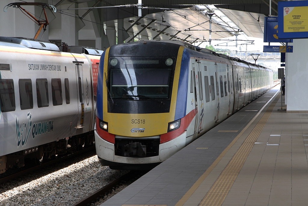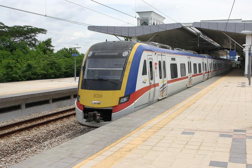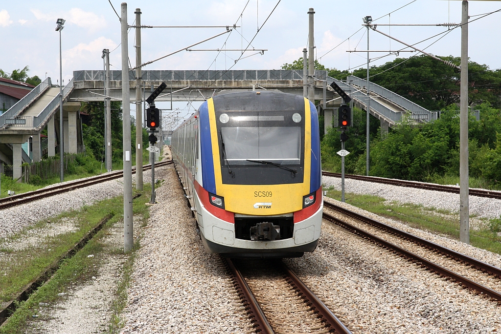 KTM Class 92, Garnitur SCS 12 (Bo′Bo′+2′2′+Bo′Bo′+Bo′Bo′+2′2′+Bo′Bo′, Hersteller: CSR Zhuzhou Electric Locomotive Co.Ltd., Baujahr: 2011) fährt am 12.März 2024 als KTM Komuter Zug 2311 von Tanjung Malim in die Zielstesen Sungai Buloh ein.