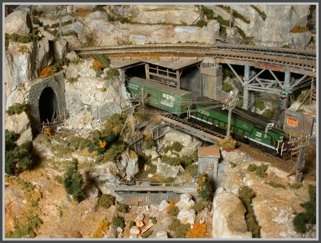 EMD SD 40 der Burlington Northern durch quert den Copper Creek Canon und passiert dabei das alte verschüttete einspurige Tunnelportal. (27.11.2010)