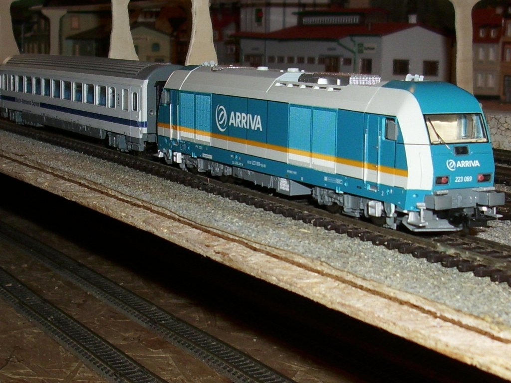 Im Original gab es schon die verschiedensten Tfz vor dem Berlin-Warschau-Express.Aus Spaß habe ich mal die ARRIVA/ALEX 223 069 vor dem Zug vorgespannnt,was es im Original sicherlich bestimmt nie geben wird.