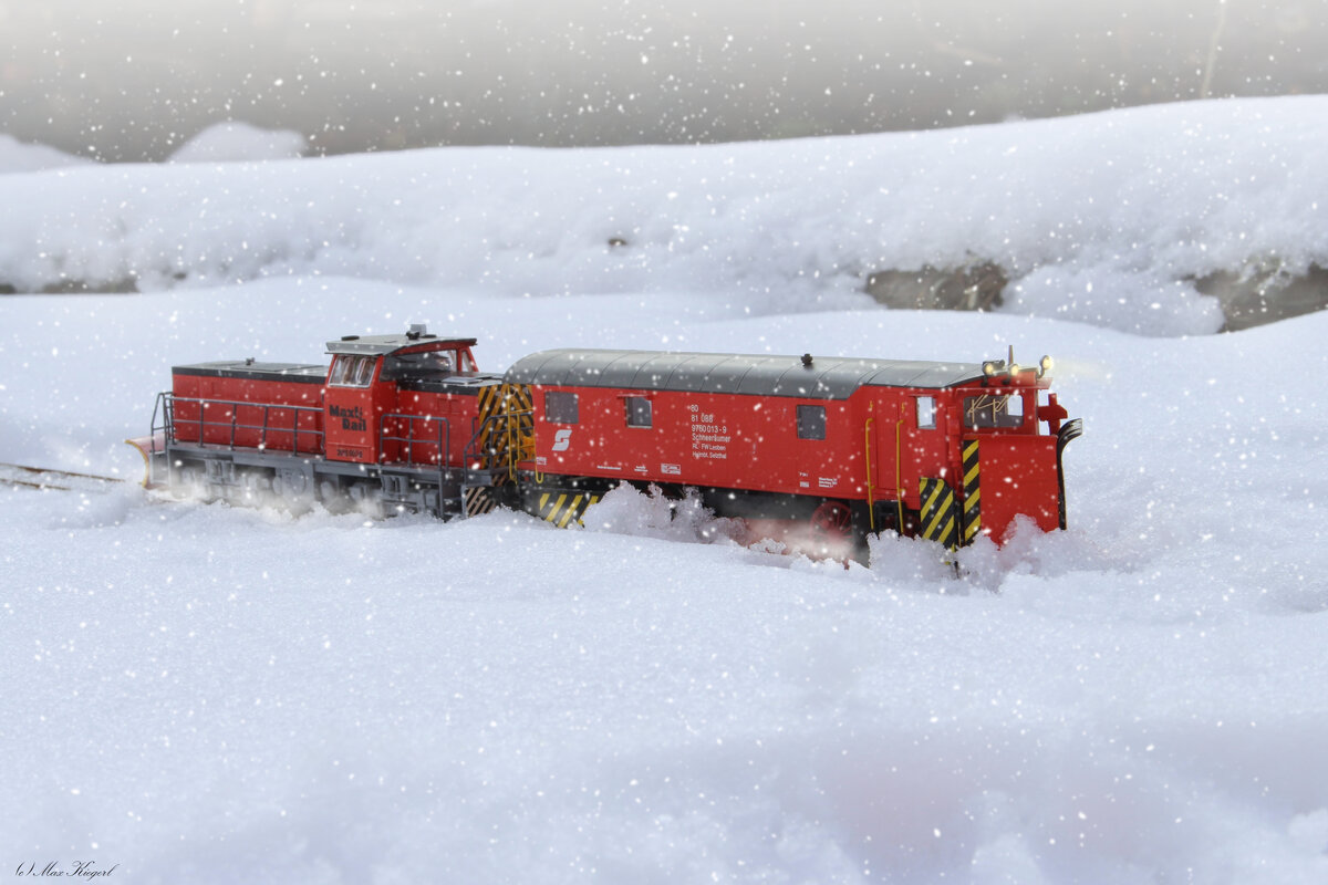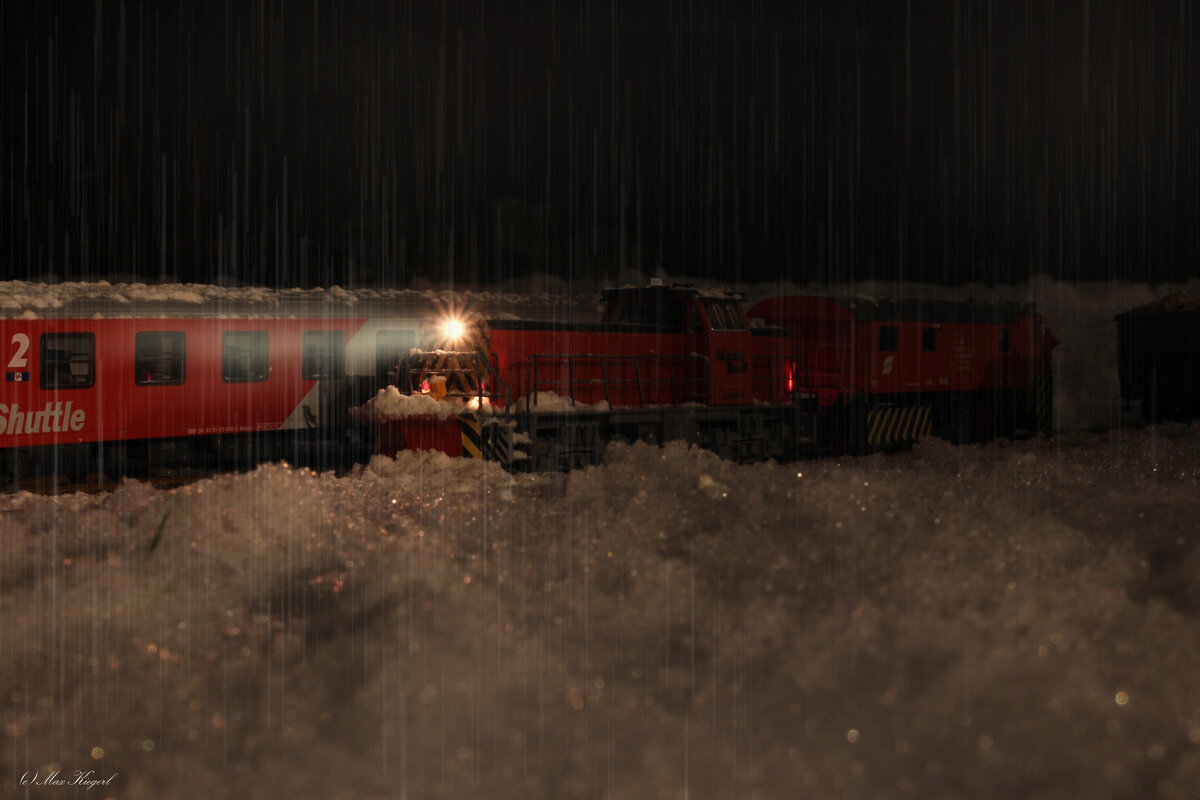 *Modell* Spät abends am 24.12.2025 ist die MaxlRail 2015 007 mit dem Klimaschneepflug bereits das zweite Mal im verschneiten Bahnhof Lassnitztal und wartet hier nach Ankunft des letzten Personenzuges auf die Abfahrt nach Lonsberg an der Lassnitz.