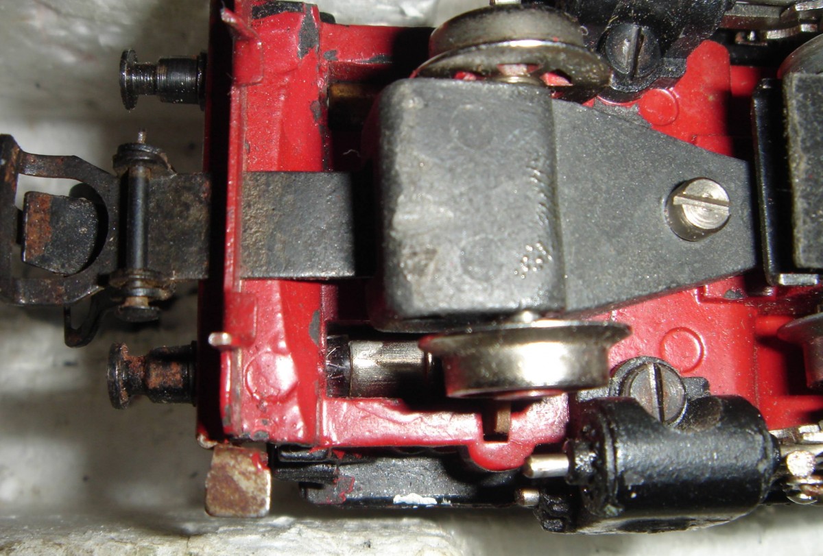 Ich möchte jetzt zeigen, wie man der TP 800.1 sachgemäß das Gehäuse abnimmt. Das ist nämlich gar nicht so einfach und erfordert eine bestimmte Sequenz, die sich am Besten mit Detailaufnahmen zeigen lässt. Hier sieht man zunächst das vordere Laufgestell von unten. Mit der ebenfalls sichtbaren vernickelten Schraube ist die Kupplungsdeichsel am Laufgestell befestigt. Diese muss zuerst abgenommen werden, damit man das Laufgestell entfernen kann. Aufnahme 28.09.2014