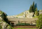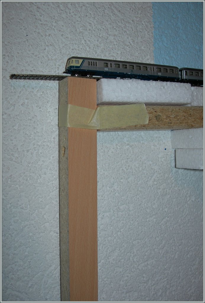 Danke für eure Kommentare zu diesem Bild. Nein Tim, hier plane ich keine Rampe, auch wenn sie sich wohl für den Schienenzeppelin perfekt eignen würde. Ich wollte nur die Pendelautomatik ausprobieren und musste dazu das Gleis über den Anlagerand (himmelblaue Fläche an der Wand) verlängern. Armin, deine Warnung kommt zu spät, der Steuerwagen genoss zu meinem Entsetzen schon einen (Sturz)-Flug!